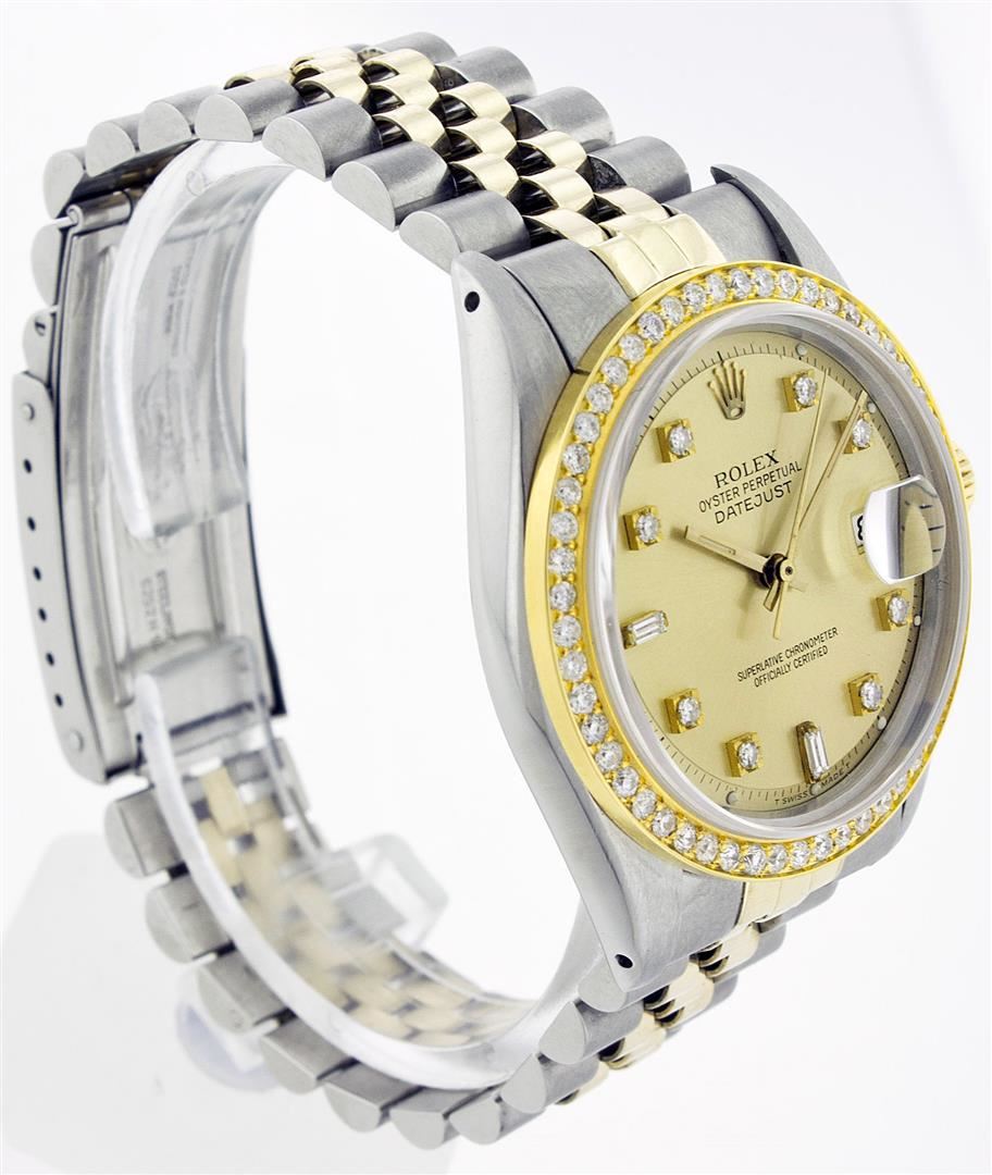 One Gents Two Tone Rolex Datejust Polished, Serviced & Electronically Tested, 14K Yellow Gold & Stainless Steel Case:36mm, 14K Yellow Gold Crown, Custom Bezel: 18K Yellow Gold Beadset Diamond Bezel, Diamond Count: 44 Diamonds Total Weight 1.0 Carat, Clarity: Si-VS, Color: G to H. Custom Crystal: Synthetic Sapphire Cyclops Lens. Movement: Automatic Winding Movement Caliber 3035. Custom Dial: Champagne Diamond Dial, Diamond Count: 8 Diamonds + 2 Baguette, Color: G to H, Clarity: SI-VS Date Window: 3 O'Clock Position Date Display, Quickset, Model: 16013 Condition: G-6 Extra Fine. Bracelet: Two Tone 14K Yellow Gold & Stainless Steel Jubilee. Bright Polish. 6.5 Inch Length, Adjustable. Standard Clasp, With Rolex Logo.