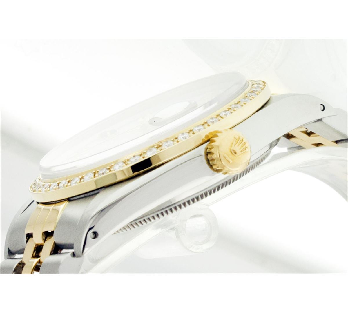 One Mens Two Tone Rolex Datejust Polished, Serviced & Electronically Tested, 14K Yellow Gold & Stainless Steel Case:36mm, 14K Yellow Gold Crown, Custom Bezel: 18K Yellow Gold Beadset Diamond Bezel, Diamond Count: 44 Diamonds Total Weight 1.00 Carat, Clarity: Si-VS, Color: G to H. Custom Crystal: Synthetic Sapphire Cyclops Lens. Movement: Automatic Winding Movement Caliber 3035. Custom Dial: Mother Of Pearl Dial Set With Diamond Hour Markers, 8 Diamonds + 2 Sapphire Baguettes in Dial G To H In Color , Date Window: 3 O'Clock Position Date Display, Quickset, Model: 16013 Condition: G-6 Extra Fine. Bracelet: Two Tone 14K Yellow Gold & Stainless Steel Jubilee. Bright Polish. 6.5 Inch Length, Adjustable. Standard Clasp, With Rolex Logo.