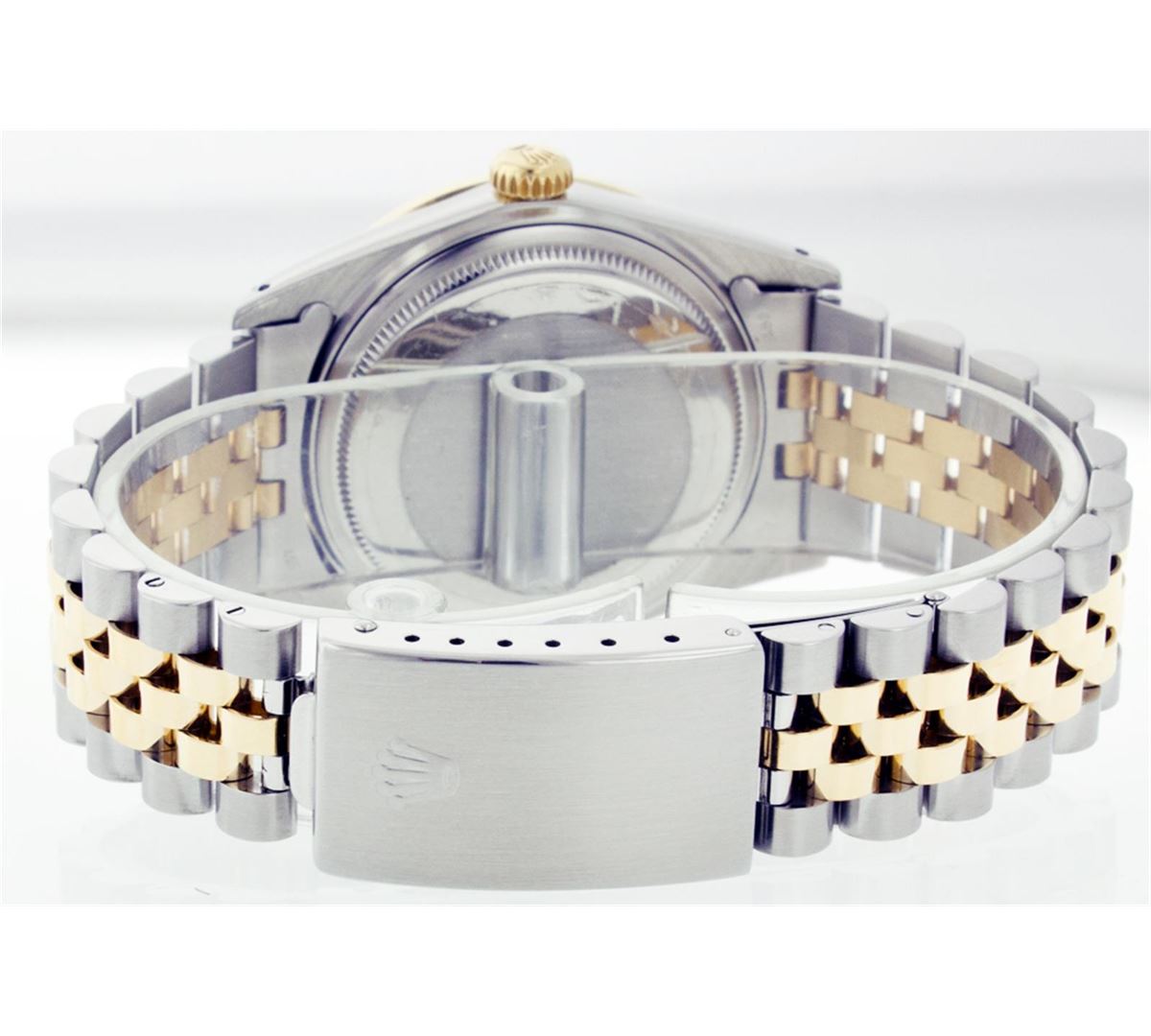 One Mens Two Tone Rolex Datejust Polished, Serviced & Electronically Tested, 14K Yellow Gold & Stainless Steel Case:36mm, 14K Yellow Gold Crown, Custom Bezel: 18K Yellow Gold Beadset Diamond Bezel, Diamond Count: 44 Diamonds Total Weight 1.00 Carat, Clarity: Si-VS, Color: G to H. Custom Crystal: Synthetic Sapphire Cyclops Lens. Movement: Automatic Winding Movement Caliber 3035. Custom Dial: Champagne Dial Set With Diamond Hour Markers and Baguette Diamonds On The Six And Nine Hour Marker, 8 Diamonds + 2 Baguettes in Dial G To H In Color, Si-VS Clarity. Date Window: 3 O'Clock Position Date Display, Quickset, Model: 16013 Condition: G-6 Extra Fine. Bracelet: Two Tone 14K Yellow Gold & Stainless Steel Jubilee. Bright Polish. 6.5 Inch Length, Adjustable. Standard Clasp, With Rolex Logo.