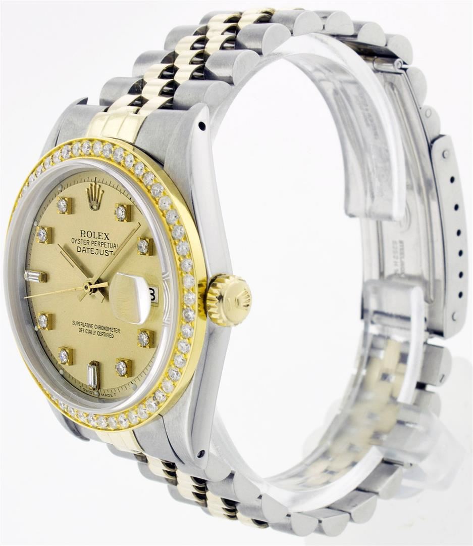 One Gents Two Tone Rolex Datejust Polished, Serviced & Electronically Tested, 14K Yellow Gold & Stainless Steel Case:36mm, 14K Yellow Gold Crown, Custom Bezel: 18K Yellow Gold Beadset Diamond Bezel, Diamond Count: 44 Diamonds Total Weight 1.0 Carat, Clarity: Si-VS, Color: G to H. Custom Crystal: Synthetic Sapphire Cyclops Lens. Movement: Automatic Winding Movement Caliber 3035. Custom Dial: Champagne Diamond Dial, Diamond Count: 8 Diamonds + 2 Baguette, Color: G to H, Clarity: SI-VS Date Window: 3 O'Clock Position Date Display, Quickset, Model: 16013 Condition: G-6 Extra Fine. Bracelet: Two Tone 14K Yellow Gold & Stainless Steel Jubilee. Bright Polish. 6.5 Inch Length, Adjustable. Standard Clasp, With Rolex Logo.