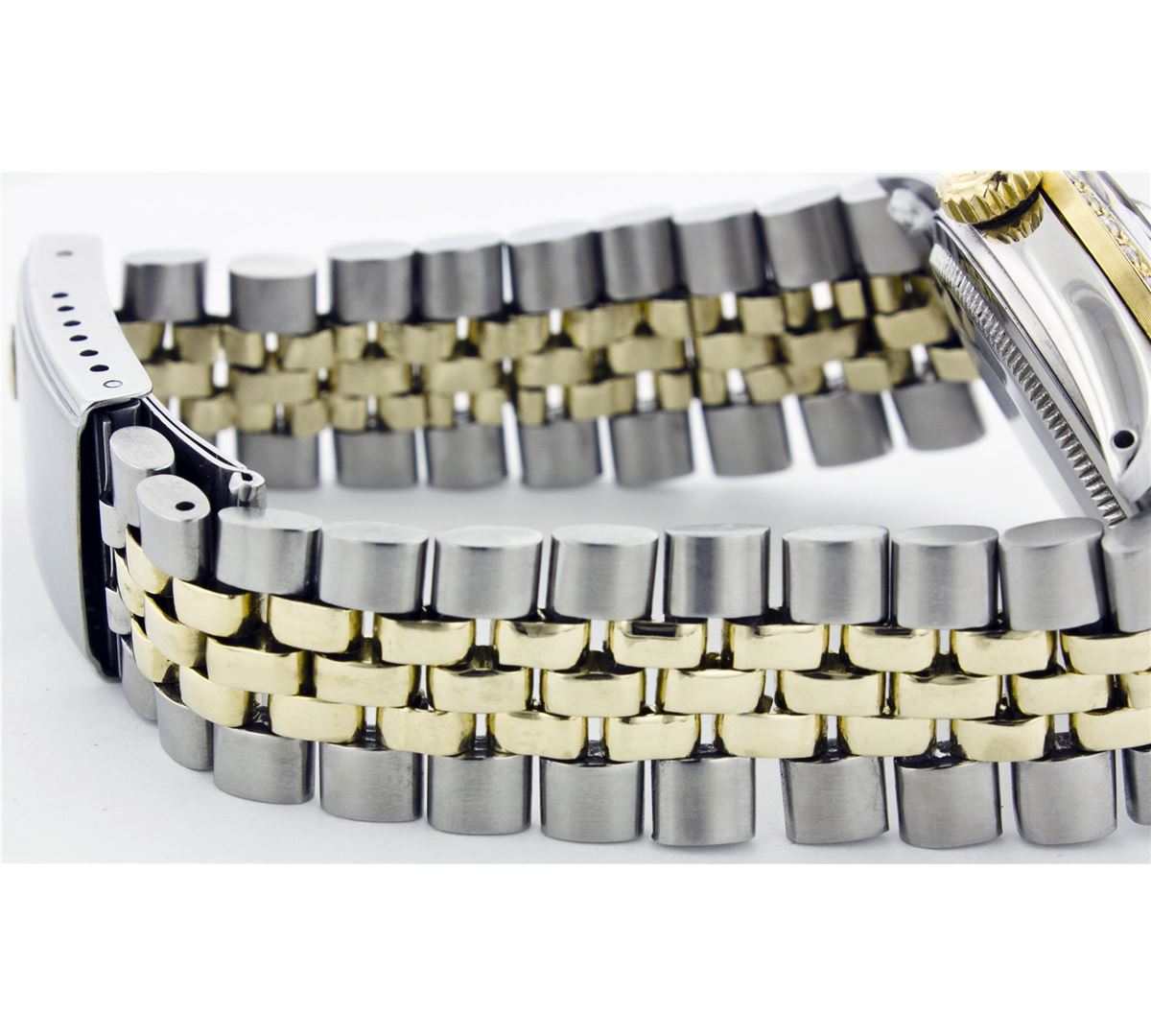 One Gents Two Tone Rolex Datejust Polished, Serviced & Electronically Tested, 14K Yellow Gold & Stainless Steel Case:36mm, 14K Yellow Gold Crown, Custom Bezel: 18K Yellow Gold Beadset Diamond Bezel, Diamond Count: 44 Diamonds Total Weight 1.0 Carat, Clarity: Si-VS, Color: G to H. Custom Crystal: Synthetic Sapphire Cyclops Lens. Movement: Automatic Winding Movement Caliber 3035. Custom Dial: Black Roman Dial. Date Window: 3 O'Clock Position Date Display, Quickset, Model: 16013 Condition: G-6 Extra Fine. Bracelet: Two Tone 14K Yellow Gold & Stainless Steel Jubilee. Bright Polish. 6.5 Inch Length, Adjustable. Standard Clasp, With Rolex Logo.