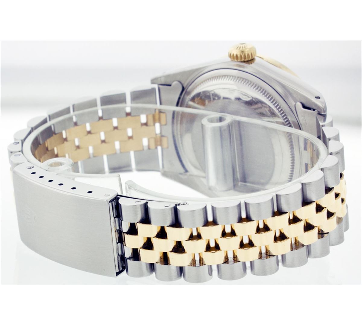 One Mens Two Tone Rolex Datejust Polished, Serviced & Electronically Tested, 14K Yellow Gold & Stainless Steel Case:36mm, 14K Yellow Gold Crown, Custom Bezel: 18K Yellow Gold Beadset Diamond Bezel, Diamond Count: 44 Diamonds Total Weight 1.00 Carat, Clarity: Si-VS, Color: G to H. Custom Crystal: Synthetic Sapphire Cyclops Lens. Movement: Automatic Winding Movement Caliber 3035. Custom Dial: Champagne Dial Set With Diamond Hour Markers and Baguette Diamonds On The Six And Nine Hour Marker, 8 Diamonds + 2 Baguettes in Dial G To H In Color, Si-VS Clarity. Date Window: 3 O'Clock Position Date Display, Quickset, Model: 16013 Condition: G-6 Extra Fine. Bracelet: Two Tone 14K Yellow Gold & Stainless Steel Jubilee. Bright Polish. 6.5 Inch Length, Adjustable. Standard Clasp, With Rolex Logo.