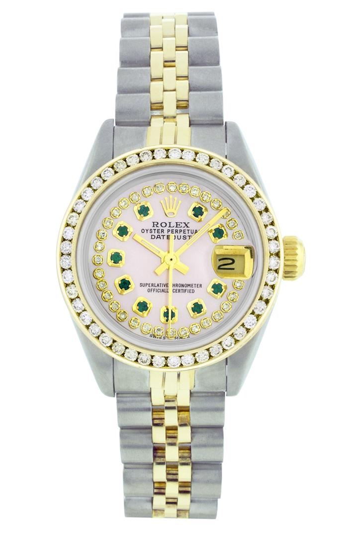 One Ladies Two Tone Rolex Datejust Polished, Serviced & Electronically Tested, 14K Yellow Gold & Stainless Steel Case:26mm, 14K Yellow Gold Crown, Custom Bezel: 18K Yellow Gold Channel Set Diamond Bezel, Diamond Count: 44 Diamonds Total Weight 1.00 Carat, Clarity: Si-VS, Color: G to H. Custom Crystal: Synthetic Sapphire Cyclops Lens. Movement: Automatic Winding Movement Caliber 2030. Custom Dial: Pink Mother Of Pearl With Emerald String Diamond Dial, Stone Count: 10 Emeralds + 33 Diamonds. Date Window: 3 O'Clock Position Date Display, Non Quickset, Model: 6917 Condition: G-6 Extra Fine. Bracelet: Two Tone 14K Yellow Gold & Stainless Steel Jubilee. Bright Polish. 5.5 Inch Length, Adjustable. Standard Clasp, With Rolex Logo.