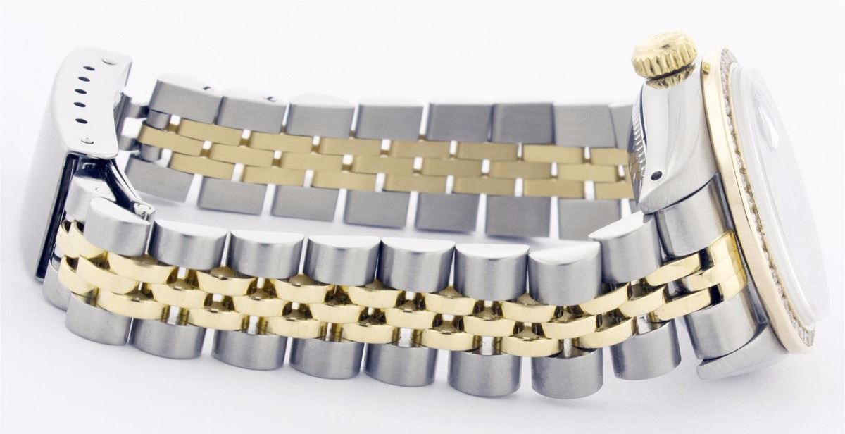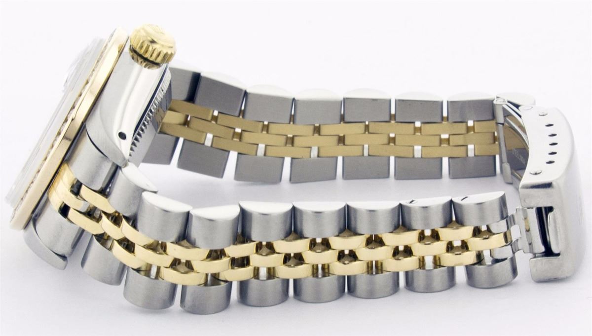 One Ladies Two Tone Rolex Datejust Polished, Serviced & Electronically Tested, 14K Yellow Gold & Stainless Steel Case:26mm, 14K Yellow Gold Crown, Custom Bezel: 18K Yellow Gold Channel Set Diamond Bezel, Diamond Count: 44 Diamonds Total Weight 1.00 Carat, Clarity: Si-VS, Color: G to H. Custom Crystal: Synthetic Sapphire Cyclops Lens. Movement: Automatic Winding Movement Caliber 2030. Custom Dial: Pink Mother Of Pearl With Emerald String Diamond Dial, Stone Count: 10 Emeralds + 33 Diamonds. Date Window: 3 O'Clock Position Date Display, Non Quickset, Model: 6917 Condition: G-6 Extra Fine. Bracelet: Two Tone 14K Yellow Gold & Stainless Steel Jubilee. Bright Polish. 5.5 Inch Length, Adjustable. Standard Clasp, With Rolex Logo.