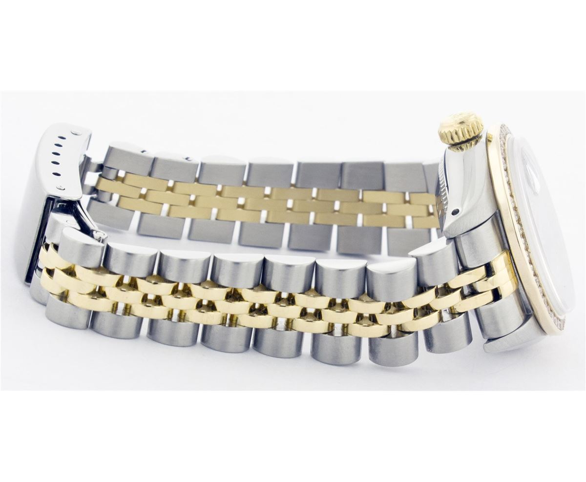 One Ladies Two Tone Rolex Datejust Polished, Serviced & Electronically Tested, 14K Yellow Gold & Stainless Steel Case:26mm, 14K Yellow Gold Crown, Custom Bezel: 18K Yellow Gold Channel Set Diamond Bezel, Diamond Count: 44 Diamonds Total Weight 1.00 Carat, Clarity: Si-VS, Color: G to H. Custom Crystal: Synthetic Sapphire Cyclops Lens. Movement: Automatic Winding Movement Caliber 2030. Custom Dial: Pink Mother Of Pearl With Emerald String Diamond Dial, Stone Count: 10 Emeralds + 33 Diamonds. Date Window: 3 O'Clock Position Date Display, Non Quickset, Model: 6917 Condition: G-6 Extra Fine. Bracelet: Two Tone 14K Yellow Gold & Stainless Steel Jubilee. Bright Polish. 5.5 Inch Length, Adjustable. Standard Clasp, With Rolex Logo.