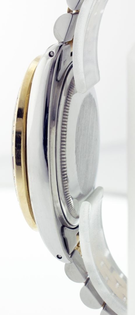 One Gents Two Tone Rolex Datejust Polished, Serviced & Electronically Tested, 14K Yellow Gold & Stainless Steel Case:36mm, 14K Yellow Gold Crown, Custom Bezel: 18K Yellow Gold Ruby Beadset Diamond Bezel, Diamond Count: 36 Diamonds + 4 Ruby Total Weight 1.0 Carat, Clarity: Si-VS, Color: G to H. Custom Crystal: Synthetic Sapphire Cyclops Lens. Movement: Automatic Winding Movement Caliber 3035. Custom Dial: Black Diamond Dial, Diamond Count: 10 Diamonds, Color: G to H, Clarity: SI-VS Date Window: 3 O'Clock Position Date Display, Quickset, Model: 16013 Condition: G-6 Extra Fine. Bracelet: Two Tone 14K Yellow Gold & Stainless Steel Jubilee. Bright Polish. 6.5 Inch Length, Adjustable. Standard Clasp, With Rolex Logo.