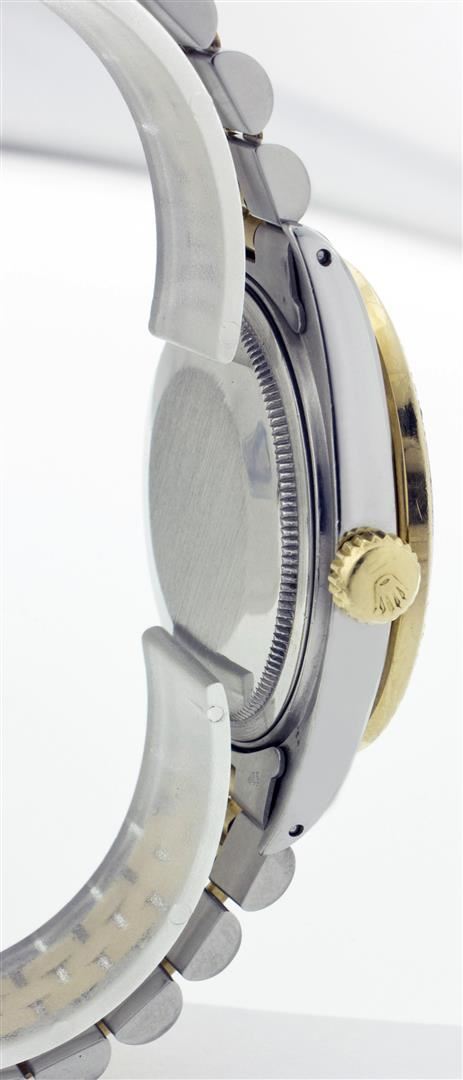 One Gents Two Tone Rolex Datejust Polished, Serviced & Electronically Tested, 14K Yellow Gold & Stainless Steel Case:36mm, 14K Yellow Gold Crown, Custom Bezel: 18K Yellow Gold Ruby Beadset Diamond Bezel, Diamond Count: 36 Diamonds + 4 Ruby Total Weight 1.0 Carat, Clarity: Si-VS, Color: G to H. Custom Crystal: Synthetic Sapphire Cyclops Lens. Movement: Automatic Winding Movement Caliber 3035. Custom Dial: Black Diamond Dial, Diamond Count: 10 Diamonds, Color: G to H, Clarity: SI-VS Date Window: 3 O'Clock Position Date Display, Quickset, Model: 16013 Condition: G-6 Extra Fine. Bracelet: Two Tone 14K Yellow Gold & Stainless Steel Jubilee. Bright Polish. 6.5 Inch Length, Adjustable. Standard Clasp, With Rolex Logo.