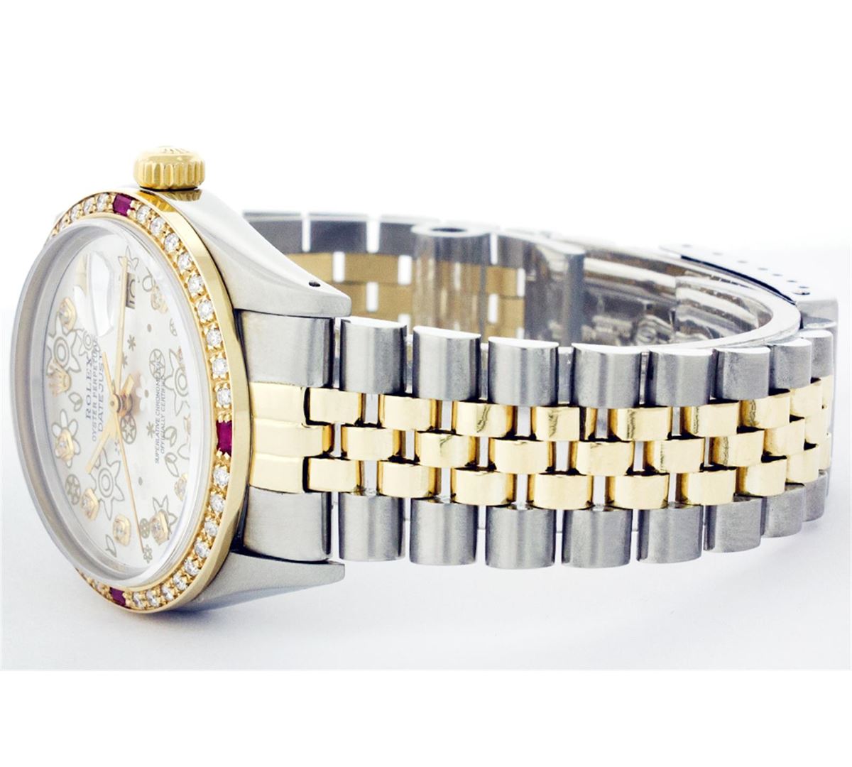 One Gents Two Tone Rolex Datejust Polished, Serviced & Electronically Tested, 14K Yellow Gold & Stainless Steel Case:36mm, 14K Yellow Gold Crown, Custom Bezel: 18K Yellow Gold Ruby Bead Set Diamond Bezel, Diamond Count: 36 Diamonds + 4 Rubies Total Weight 1.0 Carat, Clarity: Si-VS, Color: G to H. Custom Crystal: Synthetic Sapphire Cyclops Lens. Movement: Automatic Winding Movement Caliber 3035. Custom Dial: Silver Floral Diamond Dial, Diamond Count: 10 Diamonds, Color: G to H, Clarity: SI-VS Date Window: 3 O'Clock Position Date Display, Quickset, Model: 16013 Condition: G-6 Extra Fine. Bracelet: Two Tone 14K Yellow Gold & Stainless Steel Jubilee. Bright Polish. 6.5 Inch Length, Adjustable. Standard Clasp, With Rolex Logo.