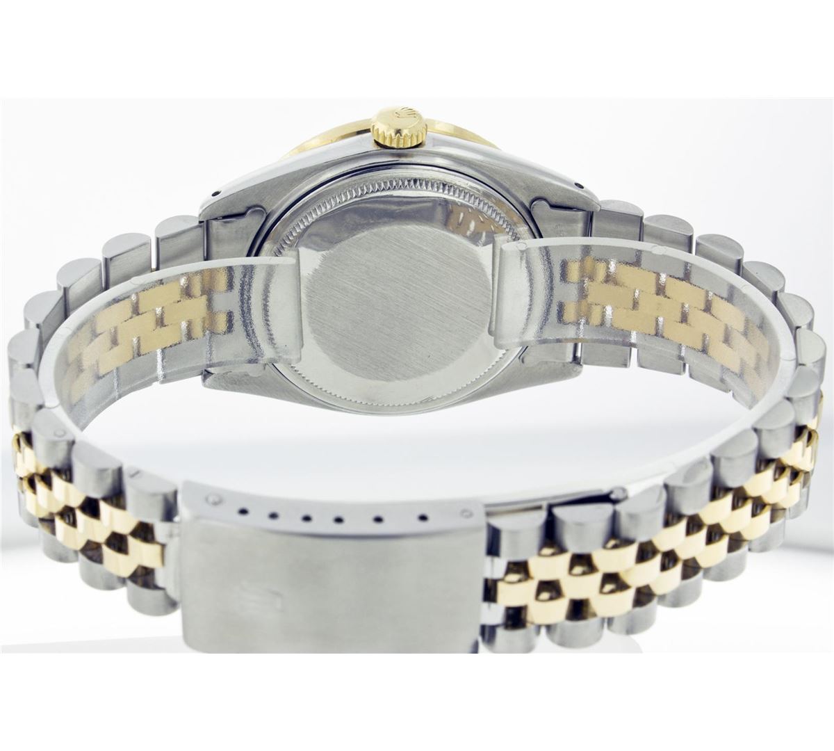 One Gents Two Tone Rolex Datejust Polished, Serviced & Electronically Tested, 14K Yellow Gold & Stainless Steel Case:36mm, 14K Yellow Gold Crown, Custom Bezel: 18K Yellow Gold Ruby Beadset Diamond Bezel, Diamond Count: 36 Diamonds + 4 Ruby Total Weight 1.0 Carat, Clarity: Si-VS, Color: G to H. Custom Crystal: Synthetic Sapphire Cyclops Lens. Movement: Automatic Winding Movement Caliber 3035. Custom Dial: Black Diamond Dial, Diamond Count: 10 Diamonds, Color: G to H, Clarity: SI-VS Date Window: 3 O'Clock Position Date Display, Quickset, Model: 16013 Condition: G-6 Extra Fine. Bracelet: Two Tone 14K Yellow Gold & Stainless Steel Jubilee. Bright Polish. 6.5 Inch Length, Adjustable. Standard Clasp, With Rolex Logo.