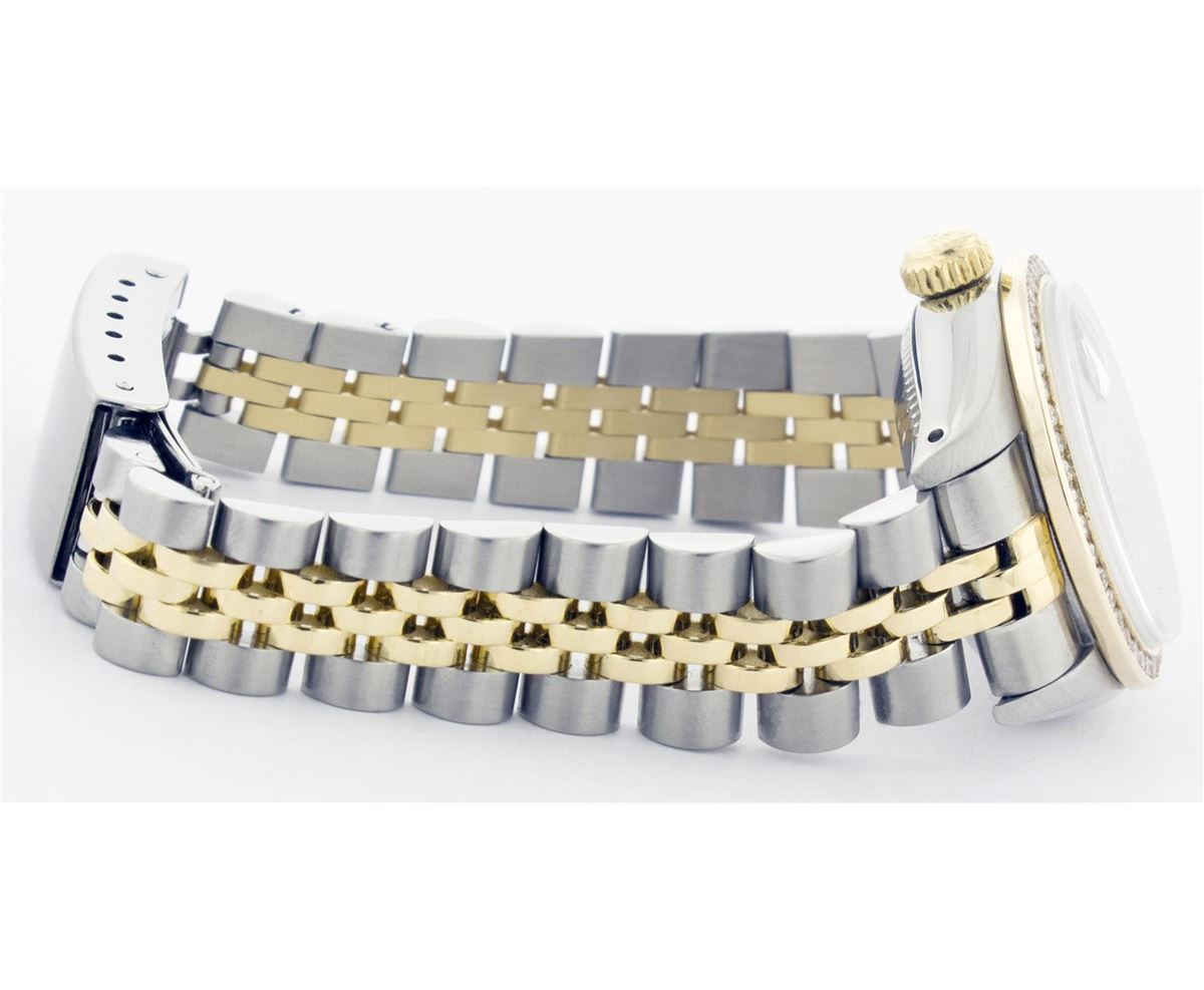 One Ladies Two Tone Rolex Datejust Polished, Serviced & Electronically Tested, 14K Yellow Gold & Stainless Steel Case:26mm, 14K Yellow Gold Crown, Custom Bezel: 18K Yellow Gold Channel Set Diamond Bezel, Diamond Count: 44 Diamonds Total Weight 1.00 Carat, Clarity: Si-VS, Color: G to H. Custom Crystal: Synthetic Sapphire Cyclops Lens. Movement: Automatic Winding Movement Caliber 2030. Custom Dial: Pink Mother Of Pearl With Sapphire String Diamond Dial, Stone Count: 10 Sapphires + 33 Diamonds. Date Window: 3 O'Clock Position Date Display, Non Quickset, Model: 6917 Condition: G-6 Extra Fine. Bracelet: Two Tone 14K Yellow Gold & Stainless Steel Jubilee. Bright Polish. 5.5 Inch Length, Adjustable. Standard Clasp, With Rolex Logo.
