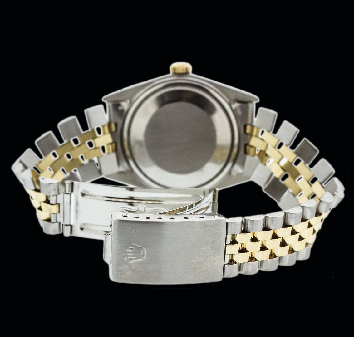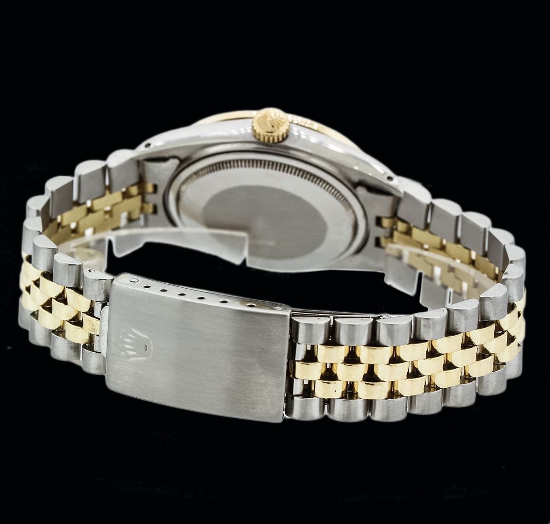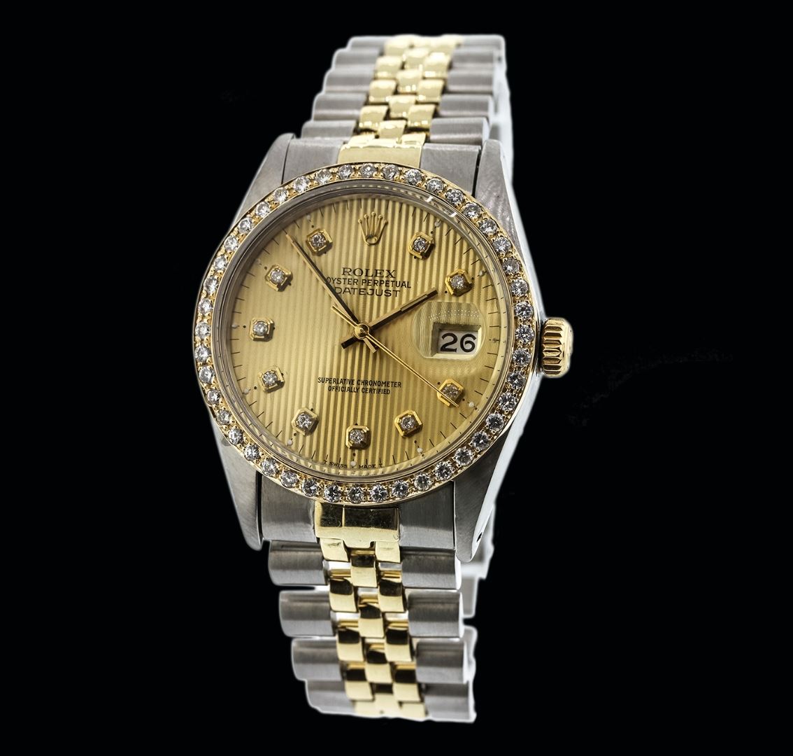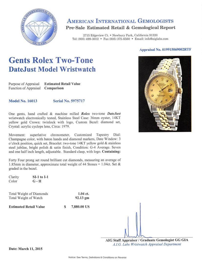One gents, hand crafted & machine milled Rolex two-tone DateJust wristwatch electronically tested, Stainless Steel Case: 36mm oyster, 14KT yellow gold Crown: twinlock with logo, Custom Bezel: diamond set, Crystal: acrylic cyclops lens, Circa: 1979.Movement: superlative chronometer, Customized Tapestry Dial: Champagne color, with baton hands and diamond markers, Date Window: 3 o'clock position, quick set, Bracelet: two-tone 14KT yellow gold & stainless steel jubilee, bright polish & satin finish, Condition: G-4 Average. Seven and one half inch length, adjustable. Standard clasp, with logo. Containing: Forty Four prong set round brilliant cut diamonds, measuring an average of 1.85mm in diameter, approximate total weight of 44 Stones = 1.04ct. Set & graded in the bezel. Clarity: SI-1 to I-1. Color: G - H. Total Weight of Diamonds 1.04ct. Total Weight of Watch 92.13 grams. AIG Appraised at $7,880.00.