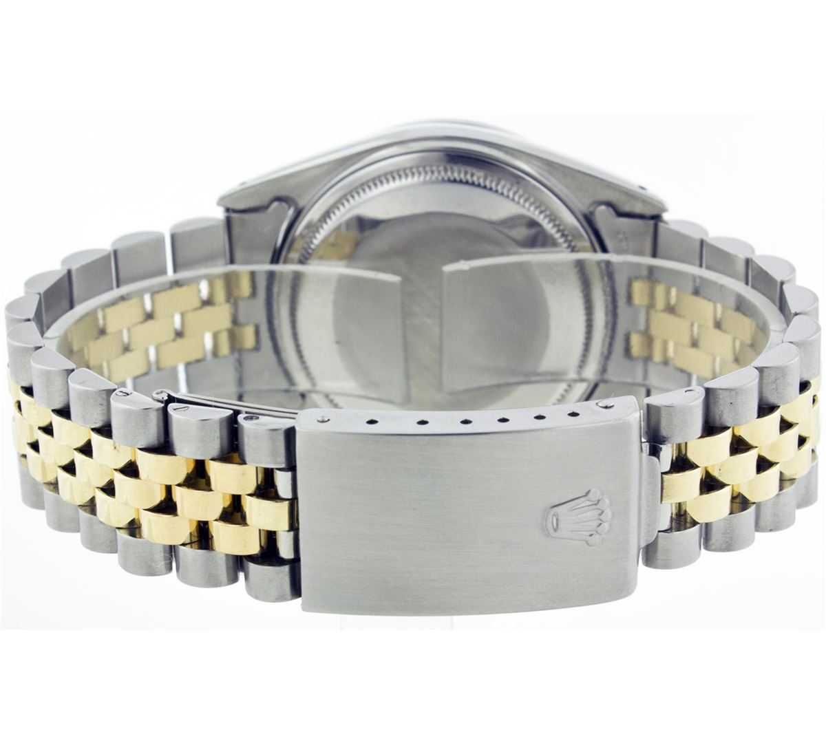 One Gents Two Tone Rolex Datejust Polished, Serviced & Electronically Tested, 14K Yellow Gold & Stainless Steel Case:36mm, 14K Yellow Gold Crown, Custom Bezel: Stainless Steel Beadset Diamond Bezel, Diamond Count: 54 Diamonds Total Weight 1.2 Carat, Clarity: Si-VS, Color: G to H. Custom Crystal: Synthetic Sapphire Cyclops Lens. Movement: Automatic Winding Movement Caliber 3035. Custom Dial: Silver Diamond Dial, Diamond Count: 10 Diamonds, Color: G to H, Clarity: SI-VS Date Window: 3 O'Clock Position Date Display, Quickset, Model: 16013 Condition: G-6 Extra Fine. Bracelet: Two Tone 14K Yellow Gold & Stainless Steel Jubilee. Bright Polish. 6.5 Inch Length, Adjustable. Standard Clasp, With Rolex Logo.