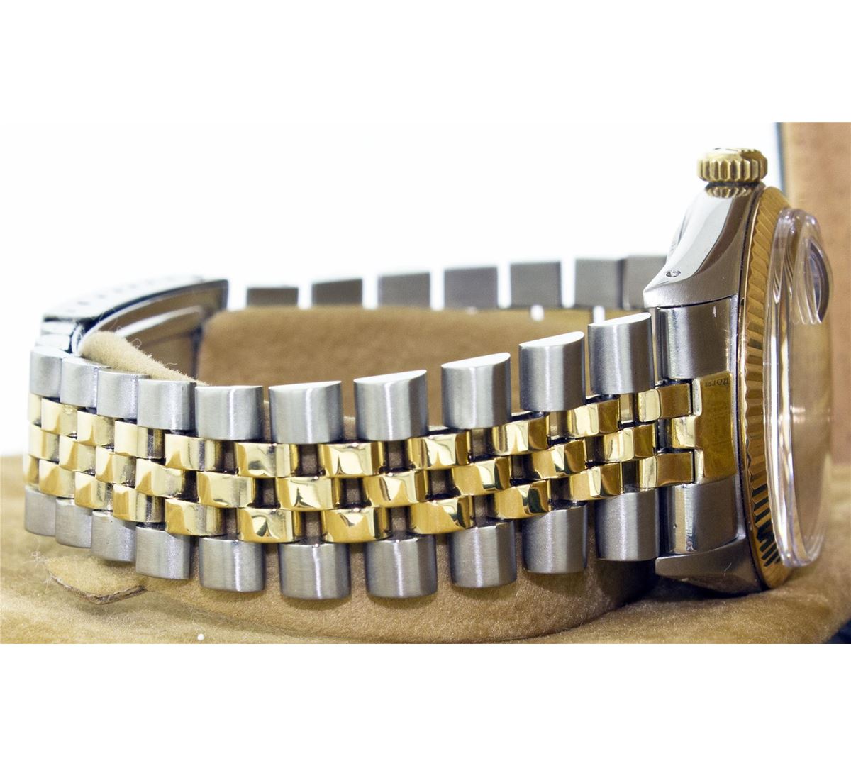 One Mens Two Tone Rolex Datejust Polished, Serviced & Electronically Tested, 14K Yellow Gold & Stainless Steel Case:36mm, 14K Yellow Gold Crown, Custom Bezel: 18K Yellow Gold Channel Set Diamond Bezel, Diamond Count: 58 Diamonds Total Weight 1.3 Carat, Clarity: Si-VS, Color: G to H. Custom Crystal: Synthetic Sapphire Cyclops Lens. Movement: Automatic Winding Movement Caliber 3035. Custom Dial: Champagne Diamond Dial, Diamond Count: 10 Diamonds, Color: G to H, Clarity: SI-VS Date Window: 3 O'Clock Position Date Display, Quickset, Model: 16013 Condition: G-6 Extra Fine. Bracelet: Two Tone 14K Yellow Gold & Stainless Steel Jubilee. Bright Polish. 6.5 Inch Length, Adjustable. Standard Clasp, With Rolex Logo.