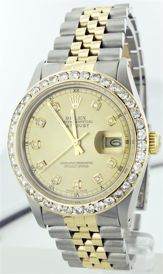 One Mens Two Tone Rolex Datejust Polished, Serviced & Electronically Tested, 14K Yellow Gold & Stainless Steel Case:36mm, 14K Yellow Gold Crown, Custom Bezel: 18K Yellow Gold Channel Set Diamond Bezel, Diamond Count: 58 Diamonds Total Weight 1.3 Carat, Clarity: Si-VS, Color: G to H. Custom Crystal: Synthetic Sapphire Cyclops Lens. Movement: Automatic Winding Movement Caliber 3035. Custom Dial: Champagne Diamond Dial, Diamond Count: 10 Diamonds, Color: G to H, Clarity: SI-VS Date Window: 3 O'Clock Position Date Display, Quickset, Model: 16013 Condition: G-6 Extra Fine. Bracelet: Two Tone 14K Yellow Gold & Stainless Steel Jubilee. Bright Polish. 6.5 Inch Length, Adjustable. Standard Clasp, With Rolex Logo.