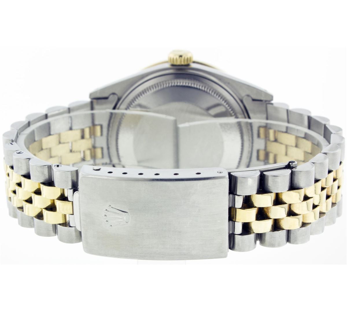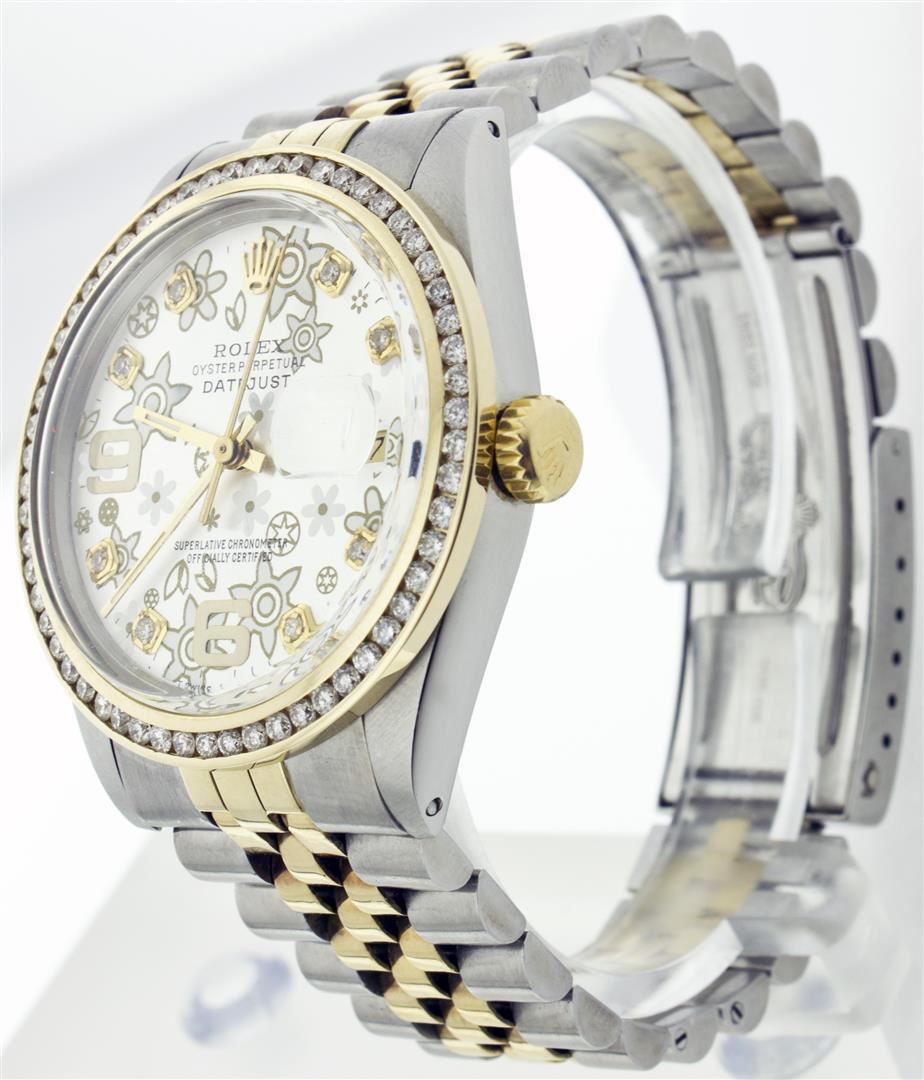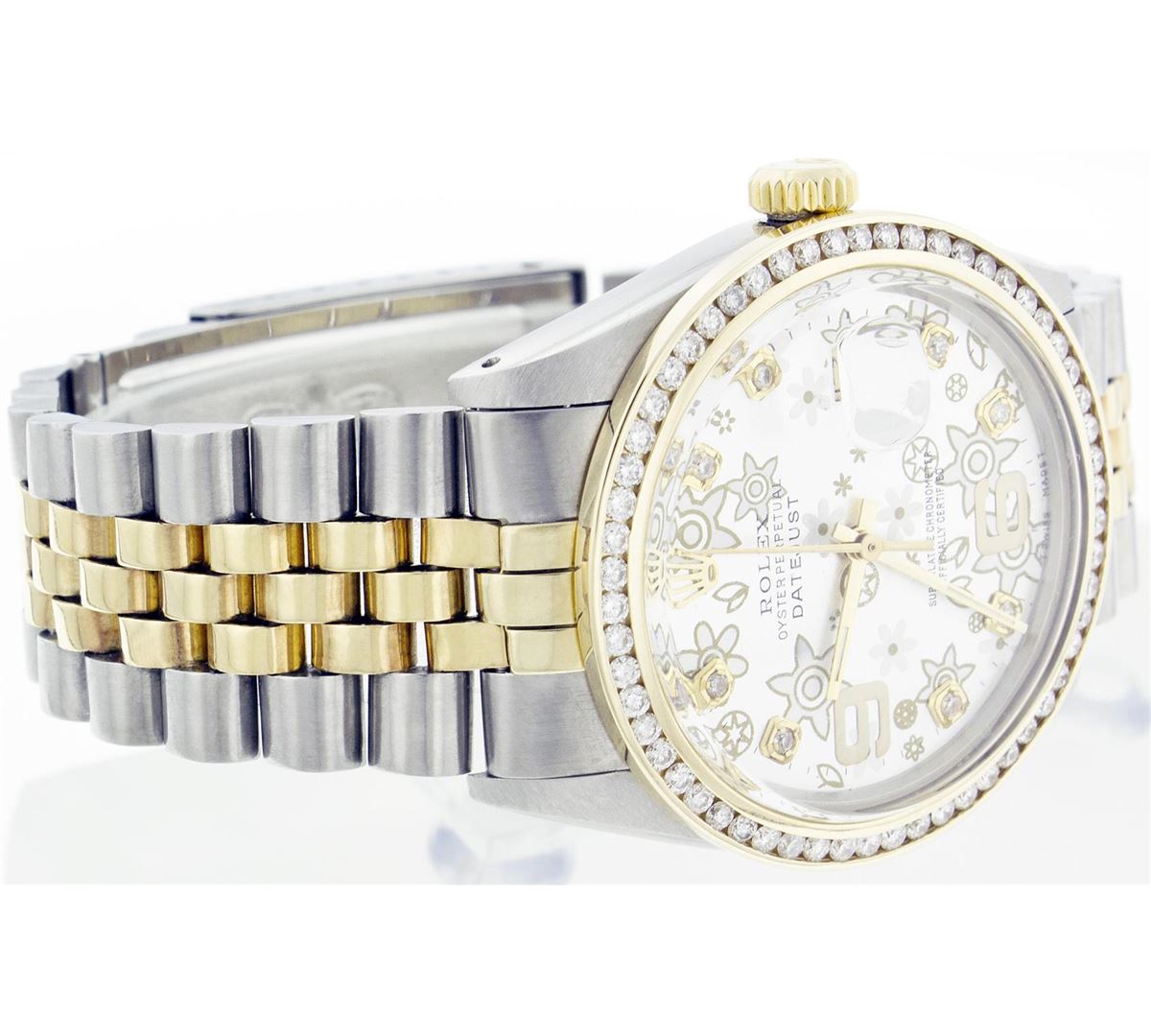 One Gents Two Tone Rolex Datejust Polished, Serviced & Electronically Tested, 14K Yellow Gold & Stainless Steel Case:36mm, 14K Yellow Gold Crown, Custom Bezel: 18K Yellow Gold Channel Set Diamond Bezel, Diamond Count: 58 Diamonds Total Weight 1.3 Carat, Clarity: Si-VS, Color: G to H. Custom Crystal: Synthetic Sapphire Cyclops Lens. Movement: Automatic Winding Movement Caliber 3035. Custom Dial: Silver Floral Dial With Diamond Hour Markers, Diamond Count: 10 Diamonds, Clarity: SI-VS, Color: G to H. Date Window: 3 O'Clock Position Date Display, Quickset, Model: 16013 Condition: G-6 Extra Fine. Bracelet: Two Tone 14K Yellow Gold & Stainless Steel Jubilee. Bright Polish. 6.5 Inch Length, Adjustable. Standard Clasp, With Rolex Logo.