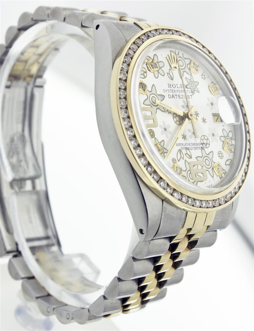 One Gents Two Tone Rolex Datejust Polished, Serviced & Electronically Tested, 14K Yellow Gold & Stainless Steel Case:36mm, 14K Yellow Gold Crown, Custom Bezel: 18K Yellow Gold Channel Set Diamond Bezel, Diamond Count: 58 Diamonds Total Weight 1.3 Carat, Clarity: Si-VS, Color: G to H. Custom Crystal: Synthetic Sapphire Cyclops Lens. Movement: Automatic Winding Movement Caliber 3035. Custom Dial: Silver Floral Dial With Diamond Hour Markers, Diamond Count: 10 Diamonds, Clarity: SI-VS, Color: G to H. Date Window: 3 O'Clock Position Date Display, Quickset, Model: 16013 Condition: G-6 Extra Fine. Bracelet: Two Tone 14K Yellow Gold & Stainless Steel Jubilee. Bright Polish. 6.5 Inch Length, Adjustable. Standard Clasp, With Rolex Logo.