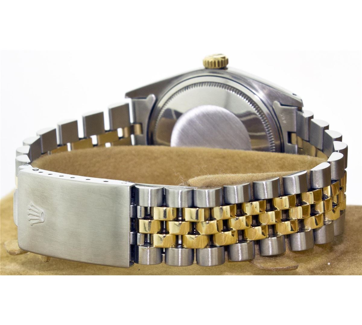One Mens Two Tone Rolex Datejust Polished, Serviced & Electronically Tested, 14K Yellow Gold & Stainless Steel Case:36mm, 14K Yellow Gold Crown, Custom Bezel: 18K Yellow Gold Channel Set Diamond Bezel, Diamond Count: 58 Diamonds Total Weight 1.3 Carat, Clarity: Si-VS, Color: G to H. Custom Crystal: Synthetic Sapphire Cyclops Lens. Movement: Automatic Winding Movement Caliber 3035. Custom Dial: Champagne Diamond Dial, Diamond Count: 10 Diamonds, Color: G to H, Clarity: SI-VS Date Window: 3 O'Clock Position Date Display, Quickset, Model: 16013 Condition: G-6 Extra Fine. Bracelet: Two Tone 14K Yellow Gold & Stainless Steel Jubilee. Bright Polish. 6.5 Inch Length, Adjustable. Standard Clasp, With Rolex Logo.