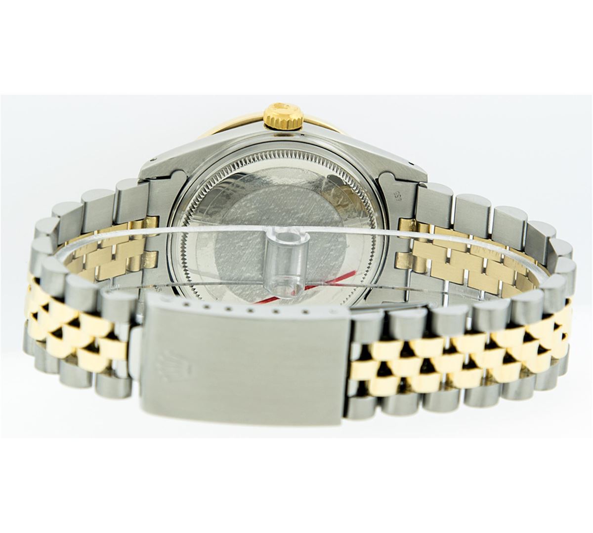 One Mens Two Tone Rolex Datejust Polished, Serviced & Electronically Tested, 14K Yellow Gold & Stainless Steel Case:36mm, 14K Yellow Gold Crown, Custom Bezel: 18K Yellow Gold Ruby Channel Set Diamond Bezel, Diamond Count: 52 Diamonds + 4 Rubies, Total Weight 1.30 Carat, Clarity: SI-VS, Color: G to H. Custom Crystal: Synthetic Sapphire Cyclops Lens. Movement: Automatic Winding Movement Caliber 3035. Custom Dial: Maroon Dial VVS , Diamond Count: 10 Single Cut Diamonds in Dial G To H In Color, VVS Clarity. Date Window: 3 O'Clock Position Date Display, Quickset, Model: 16013 Condition: G-6 Extra Fine. Bracelet: Two Tone 14K Yellow Gold & Stainless Steel Jubilee. Bright Polish. 7.0 Inch Length, Adjustable. Standard Clasp, With Rolex Logo.