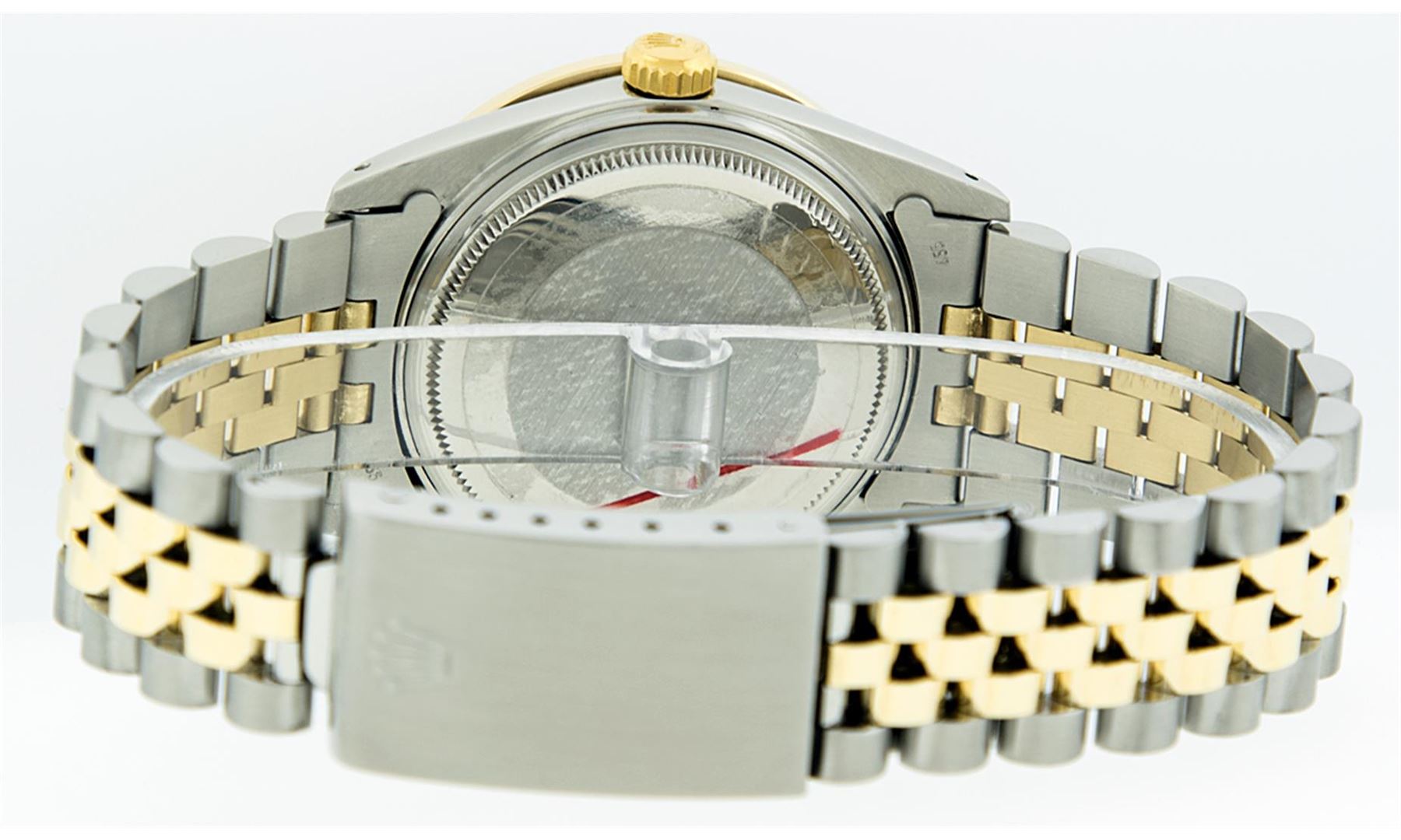 One Mens Two Tone Rolex Datejust Polished, Serviced & Electronically Tested, 14K Yellow Gold & Stainless Steel Case:36mm, 14K Yellow Gold Crown, Custom Bezel: 18K Yellow Gold Ruby Channel Set Diamond Bezel, Diamond Count: 52 Diamonds + 4 Rubies, Total Weight 1.30 Carat, Clarity: SI-VS, Color: G to H. Custom Crystal: Synthetic Sapphire Cyclops Lens. Movement: Automatic Winding Movement Caliber 3035. Custom Dial: Maroon Dial VVS , Diamond Count: 10 Single Cut Diamonds in Dial G To H In Color, VVS Clarity. Date Window: 3 O'Clock Position Date Display, Quickset, Model: 16013 Condition: G-6 Extra Fine. Bracelet: Two Tone 14K Yellow Gold & Stainless Steel Jubilee. Bright Polish. 7.0 Inch Length, Adjustable. Standard Clasp, With Rolex Logo.