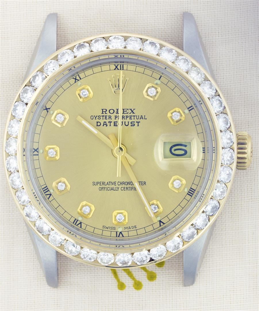 One Mens Two Tone Rolex Datejust Polished, Serviced & Electronically Tested, 14K Yellow Gold & Stainless Steel Case:36mm, 14K Yellow Gold Crown, Custom Bezel: 18K Yellow Gold Channel Set Diamond Bezel, Diamond Count: 58 Diamonds Total Weight 1.3 Carat, Clarity: Si-VS, Color: G to H. Custom Crystal: Synthetic Sapphire Cyclops Lens. Movement: Automatic Winding Movement Caliber 3035. Custom Dial: Champagne Diamond Dial, Diamond Count: 10 Diamonds, Color: G to H, Clarity: SI-VS Date Window: 3 O'Clock Position Date Display, Quickset, Model: 16013 Condition: G-6 Extra Fine. Bracelet: Two Tone 14K Yellow Gold & Stainless Steel Jubilee. Bright Polish. 6.5 Inch Length, Adjustable. Standard Clasp, With Rolex Logo.