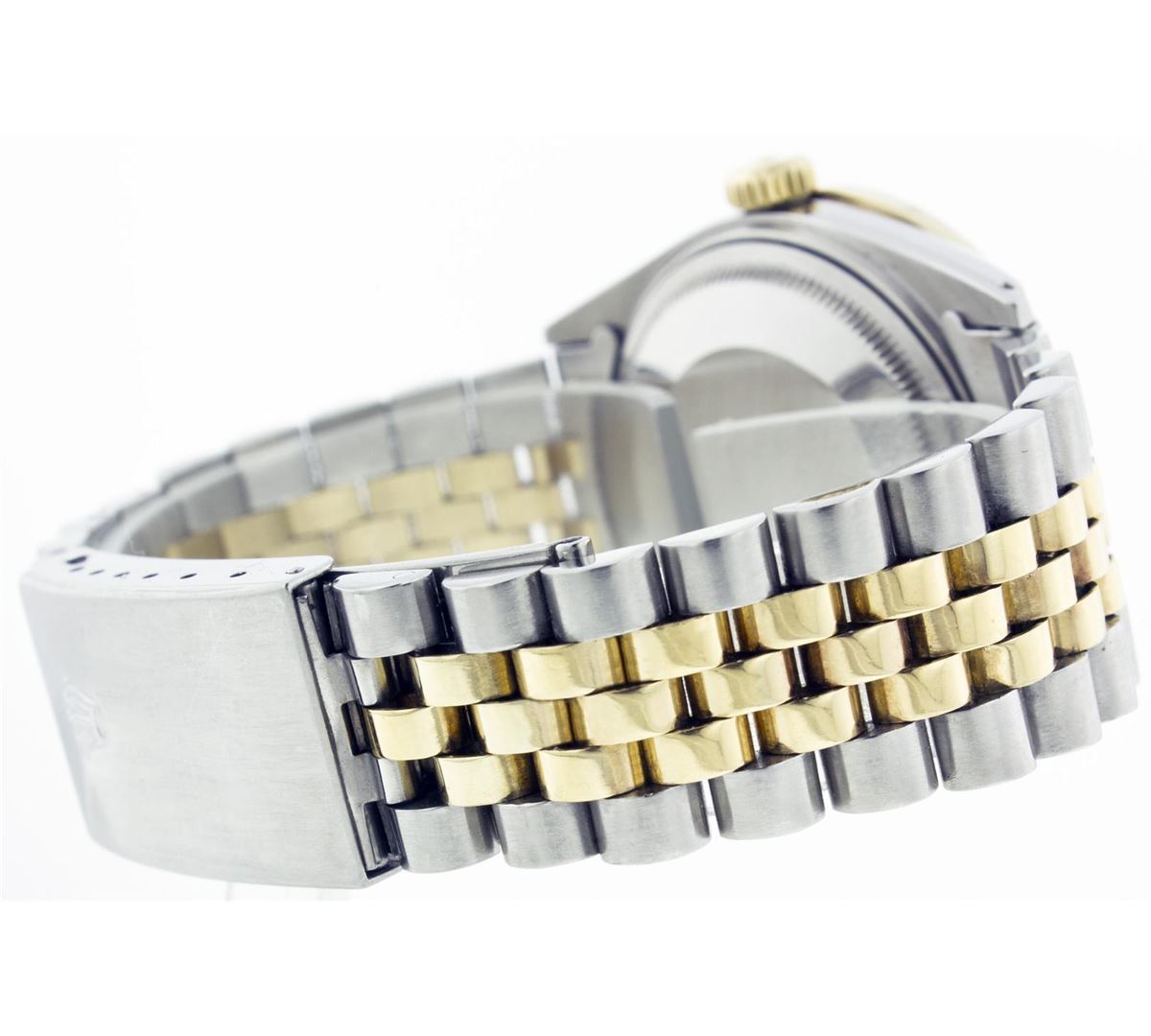 One Gents Two Tone Rolex Datejust Polished, Serviced & Electronically Tested, 14K Yellow Gold & Stainless Steel Case:36mm, 14K Yellow Gold Crown, Custom Bezel: 18K Yellow Gold Channel Set Diamond Bezel, Diamond Count: 58 Diamonds Total Weight 1.3 Carat, Clarity: Si-VS, Color: G to H. Custom Crystal: Synthetic Sapphire Cyclops Lens. Movement: Automatic Winding Movement Caliber 3035. Custom Dial: Silver Floral Dial With Diamond Hour Markers, Diamond Count: 10 Diamonds, Clarity: SI-VS, Color: G to H. Date Window: 3 O'Clock Position Date Display, Quickset, Model: 16013 Condition: G-6 Extra Fine. Bracelet: Two Tone 14K Yellow Gold & Stainless Steel Jubilee. Bright Polish. 6.5 Inch Length, Adjustable. Standard Clasp, With Rolex Logo.