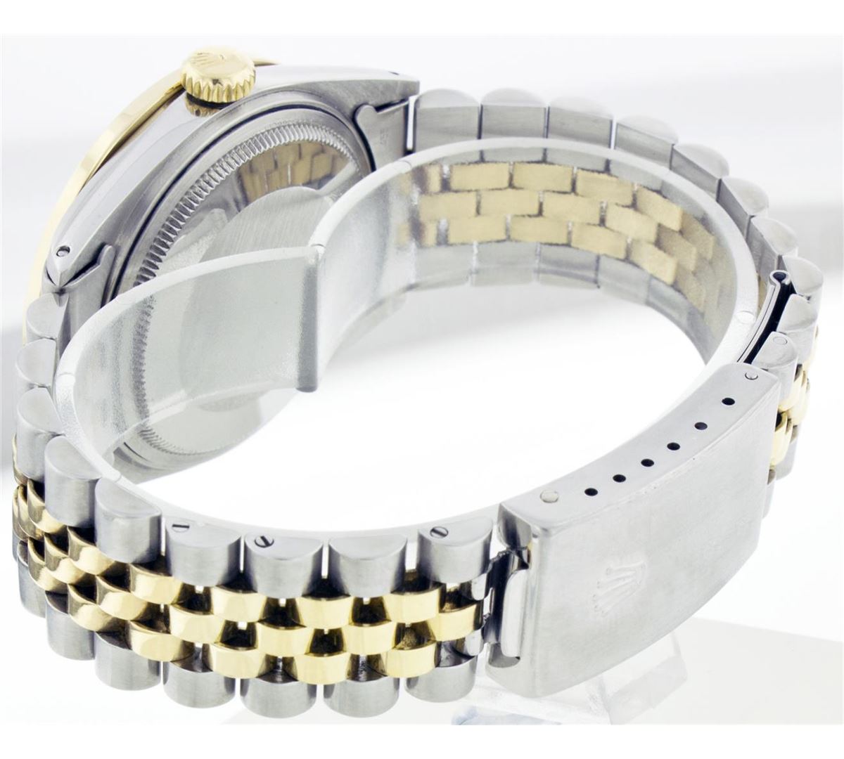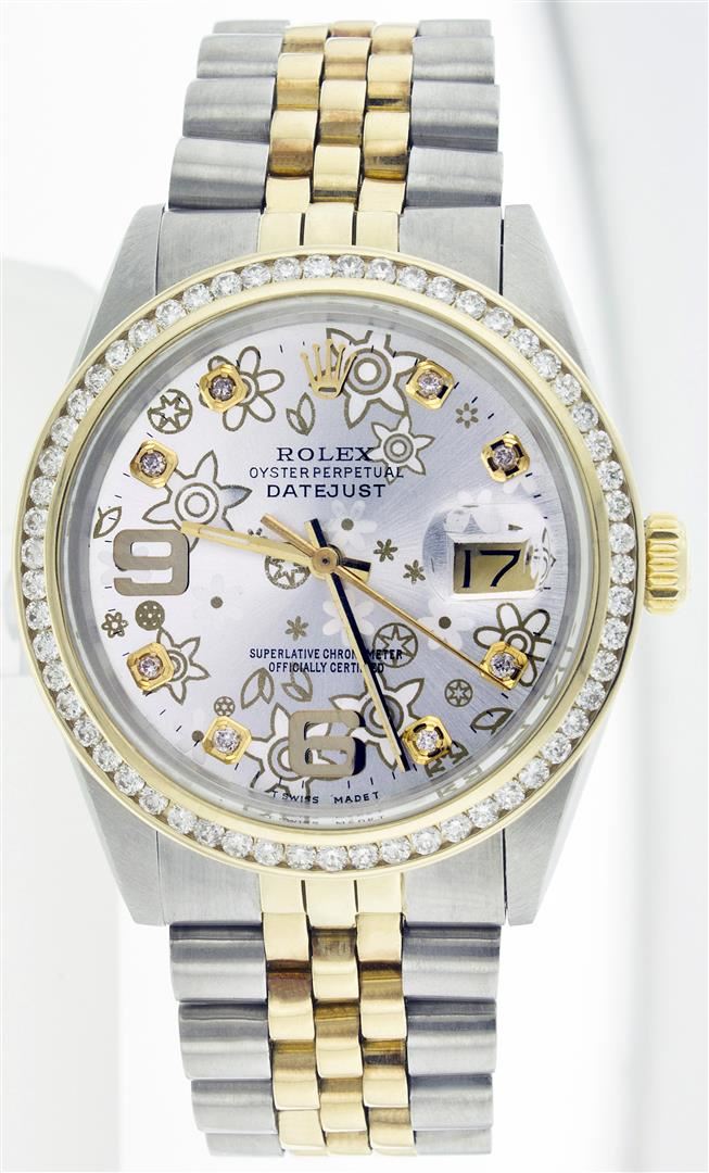 One Gents Two Tone Rolex Datejust Polished, Serviced & Electronically Tested, 14K Yellow Gold & Stainless Steel Case:36mm, 14K Yellow Gold Crown, Custom Bezel: 18K Yellow Gold Channel Set Diamond Bezel, Diamond Count: 58 Diamonds Total Weight 1.3 Carat, Clarity: Si-VS, Color: G to H. Custom Crystal: Synthetic Sapphire Cyclops Lens. Movement: Automatic Winding Movement Caliber 3035. Custom Dial: Silver Floral Dial With Diamond Hour Markers, Diamond Count: 10 Diamonds, Clarity: SI-VS, Color: G to H. Date Window: 3 O'Clock Position Date Display, Quickset, Model: 16013 Condition: G-6 Extra Fine. Bracelet: Two Tone 14K Yellow Gold & Stainless Steel Jubilee. Bright Polish. 6.5 Inch Length, Adjustable. Standard Clasp, With Rolex Logo.