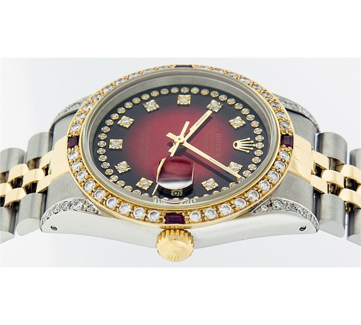 One Mens Two Tone Rolex Datejust Polished, Serviced & Electronically Tested,14K Yellow Gold And Stainless Steel Case:36mm, Diamond Lugs: Diamond Count: 24 Diamonds In Lugs, Diamond Weight: .35 Carat. Clarity SI-VS, Color: G to H. 14K Yellow Gold Crown, Custom Bezel: 18K Yellow Gold Ruby Beadset Diamond Bezel. Diamond Count: 36 Diamonds + 4 Rubies. Total Weight 1.0 Carat, Clarity: SI-VS, Color: G to H. Custom Crystal: Synthetic Sapphire Cyclops Lens. Movement: Automatic Winding Movement Caliber 3035. Custom Dial: Red Vignette String Diamond Dial VVS, Diamond Count: 58 Diamonds In Dial, Clarity: SI-VS, Color: VVS. Date Window: 3 O'Clock Position Date Display, Quickset, Model: 16013 Condition: G-6 Extra Fine. Bracelet: 14K Yellow Gold And Stainless Steel Jubilee. Bright Polish & Satin Finish. 7.0 Inch Length, Adjustable. Standard Clasp, With Rolex Logo. Comes with 6 month warranty.