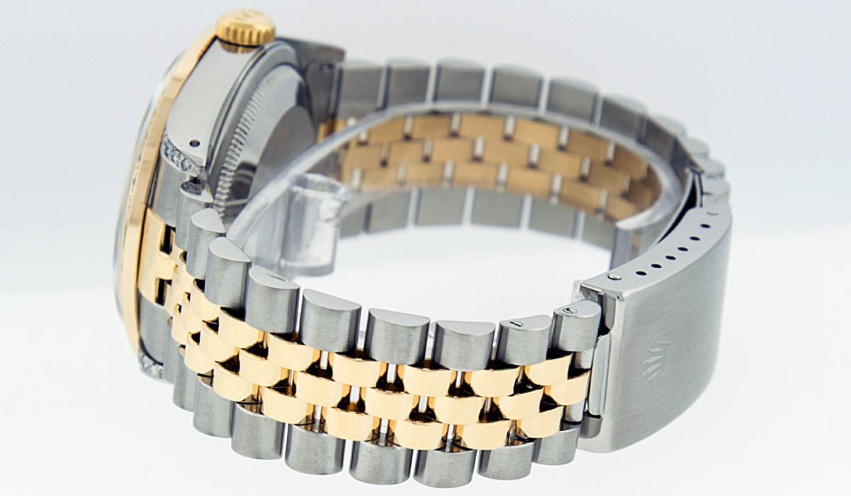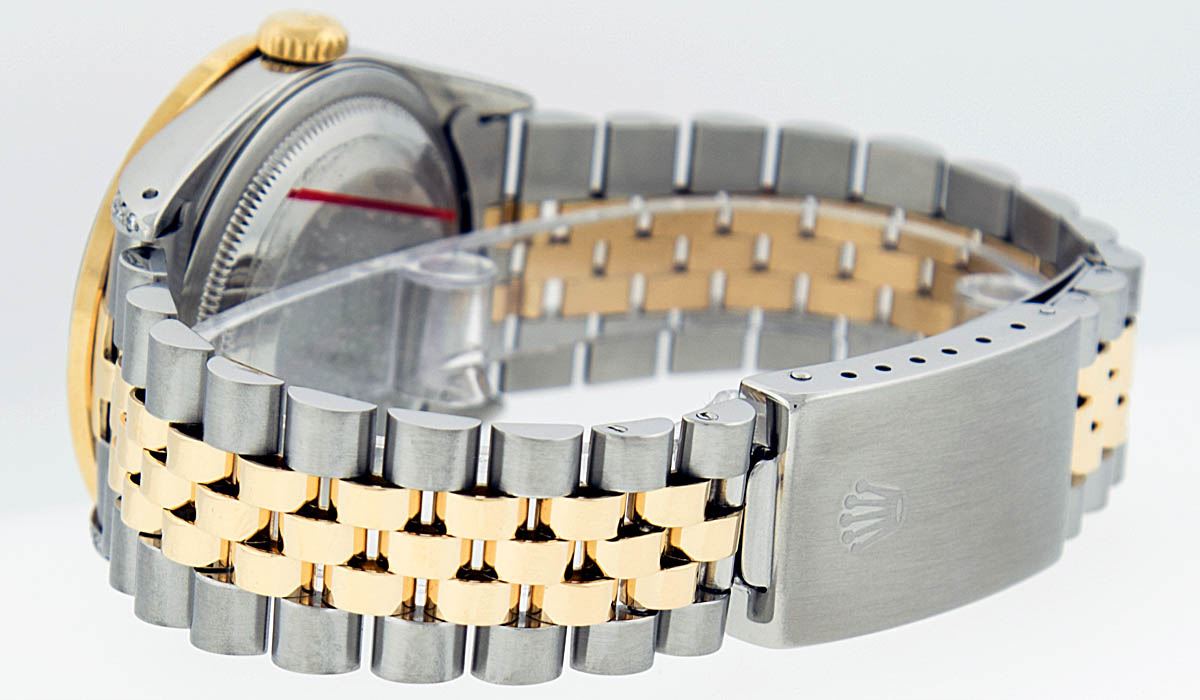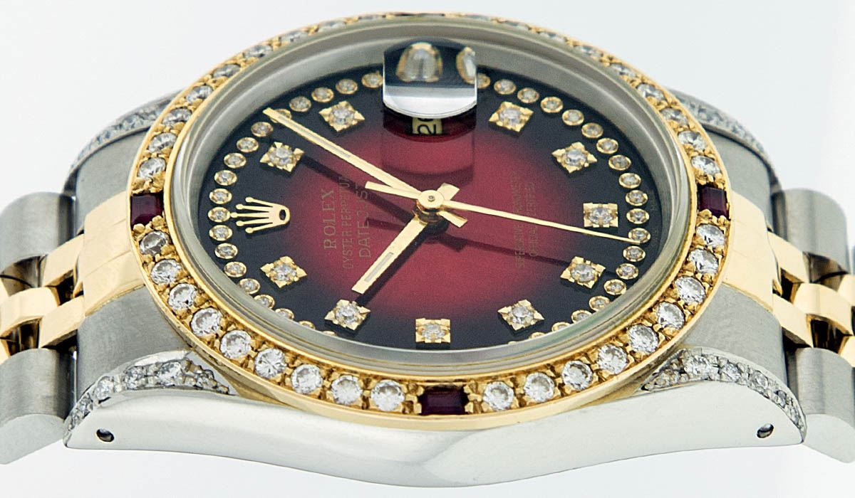 One Mens Two Tone Rolex Datejust Polished, Serviced & Electronically Tested,14K Yellow Gold And Stainless Steel Case:36mm, Diamond Lugs: Diamond Count: 24 Diamonds In Lugs, Diamond Weight: .35 Carat. Clarity SI-VS, Color: G to H. 14K Yellow Gold Crown, Custom Bezel: 18K Yellow Gold Ruby Beadset Diamond Bezel. Diamond Count: 36 Diamonds + 4 Rubies. Total Weight 1.0 Carat, Clarity: SI-VS, Color: G to H. Custom Crystal: Synthetic Sapphire Cyclops Lens. Movement: Automatic Winding Movement Caliber 3035. Custom Dial: Red Vignette String Diamond Dial VVS, Diamond Count: 58 Diamonds In Dial, Clarity: SI-VS, Color: VVS. Date Window: 3 O'Clock Position Date Display, Quickset, Model: 16013 Condition: G-6 Extra Fine. Bracelet: 14K Yellow Gold And Stainless Steel Jubilee. Bright Polish & Satin Finish. 7.0 Inch Length, Adjustable. Standard Clasp, With Rolex Logo. Comes with 6 month warranty.