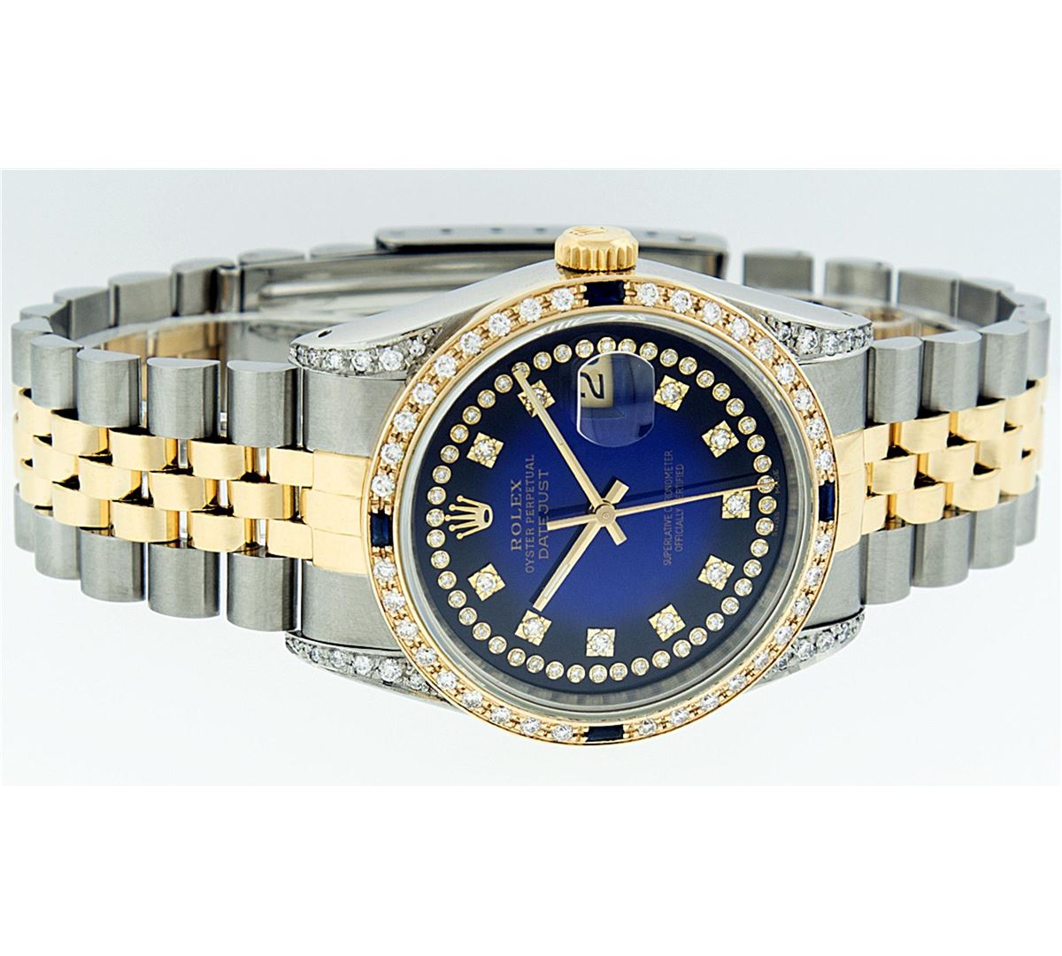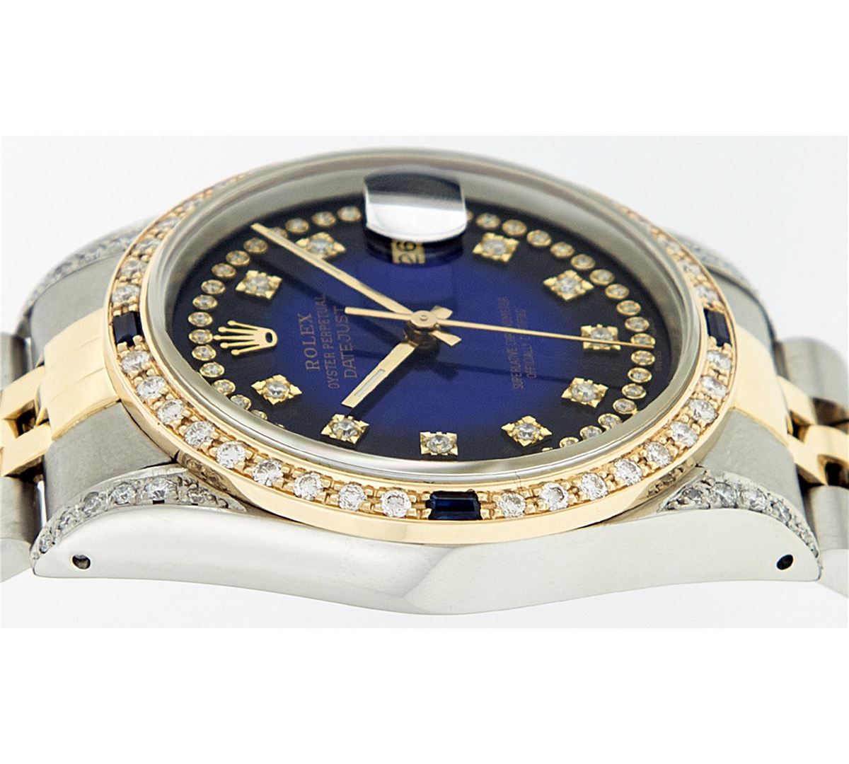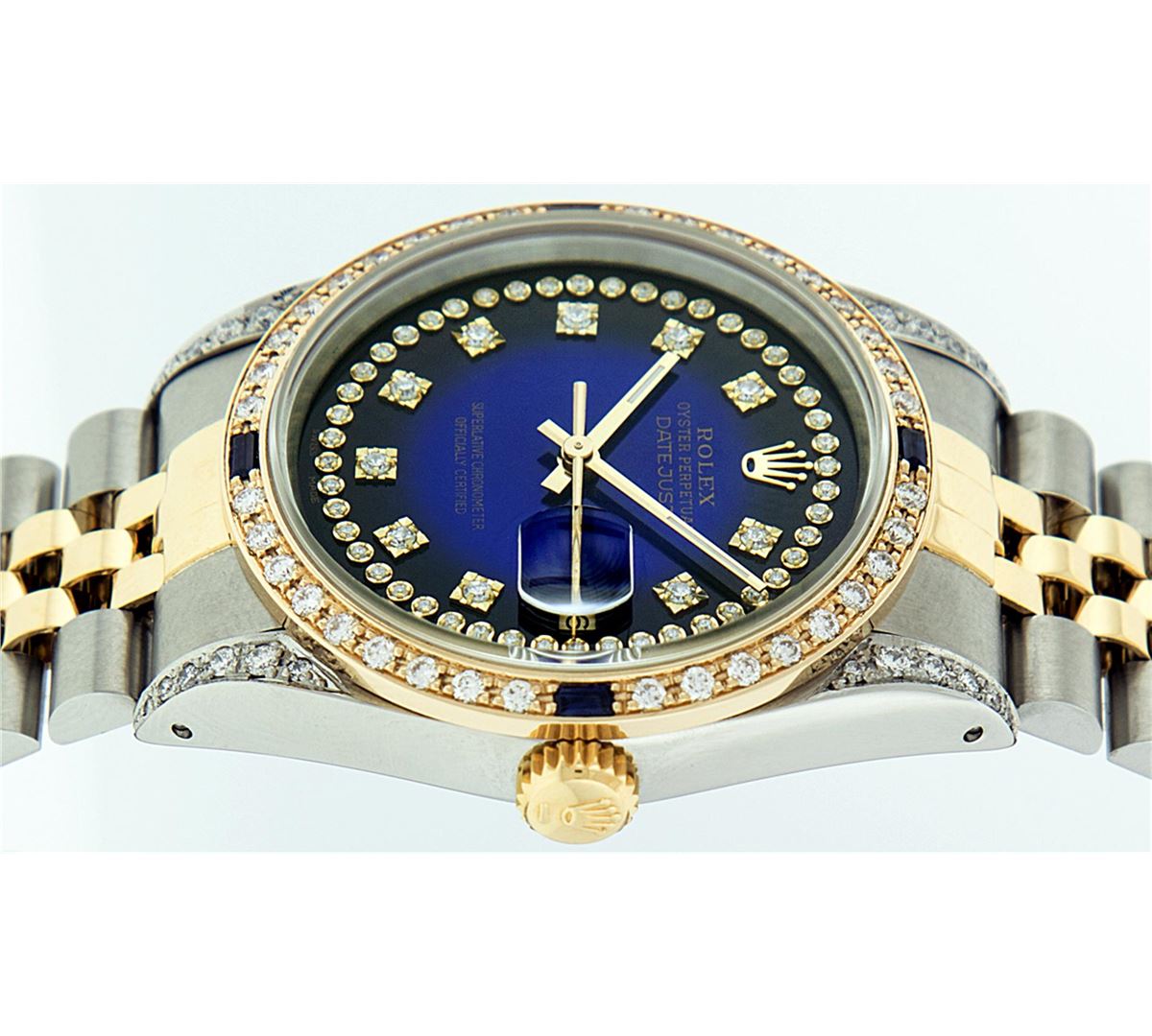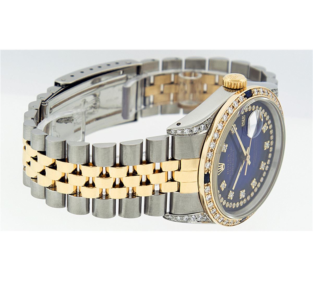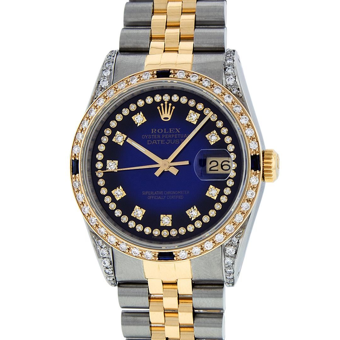 One Mens Two Tone Rolex Datejust Polished, Serviced & Electronically Tested,14K Yellow Gold And Stainless Steel Case:36mm, Diamond Lugs: Diamond Count: 24 Diamonds In Lugs, Diamond Weight: .35 Carat. Clarity SI-VS, Color: G to H. 14K Yellow Gold Crown, Custom Bezel: 18K Yellow Gold Sapphire Beadset Diamond Bezel. Diamond Count: 36 Diamonds + 4 Sapphires. Total Weight 1.0 Carat, Clarity: SI-VS, Color: G to H. Custom Crystal: Synthetic Sapphire Cyclops Lens. Movement: Automatic Winding Movement Caliber 3035. Custom Dial: Blue Vignette String Diamond Dial VVS, Diamond Count: 58 Diamonds In Dial, Clarity: SI-VS, Color: VVS. Date Window: 3 O'Clock Position Date Display, Quickset, Model: 16013 Condition: G-6 Extra Fine. Bracelet: 14K Yellow Gold And Stainless Steel Jubilee. Bright Polish & Satin Finish. 7.0 Inch Length, Adjustable. Standard Clasp, With Rolex Logo. Comes with 6 month warranty.