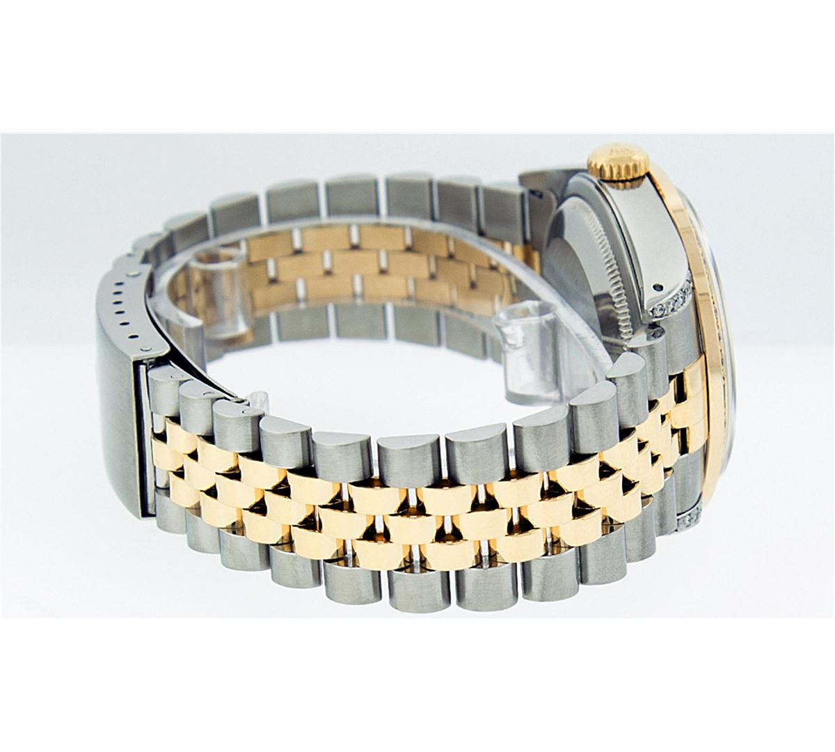 One Mens Two Tone Rolex Datejust Polished, Serviced & Electronically Tested,14K Yellow Gold And Stainless Steel Case:36mm, Diamond Lugs: Diamond Count: 24 Diamonds In Lugs, Diamond Weight: .35 Carat. Clarity SI-VS, Color: G to H. 14K Yellow Gold Crown, Custom Bezel: 18K Yellow Gold Sapphire Beadset Diamond Bezel. Diamond Count: 36 Diamonds + 4 Sapphires. Total Weight 1.0 Carat, Clarity: SI-VS, Color: G to H. Custom Crystal: Synthetic Sapphire Cyclops Lens. Movement: Automatic Winding Movement Caliber 3035. Custom Dial: Blue Vignette String Diamond Dial VVS, Diamond Count: 58 Diamonds In Dial, Clarity: SI-VS, Color: VVS. Date Window: 3 O'Clock Position Date Display, Quickset, Model: 16013 Condition: G-6 Extra Fine. Bracelet: 14K Yellow Gold And Stainless Steel Jubilee. Bright Polish & Satin Finish. 7.0 Inch Length, Adjustable. Standard Clasp, With Rolex Logo. Comes with 6 month warranty.