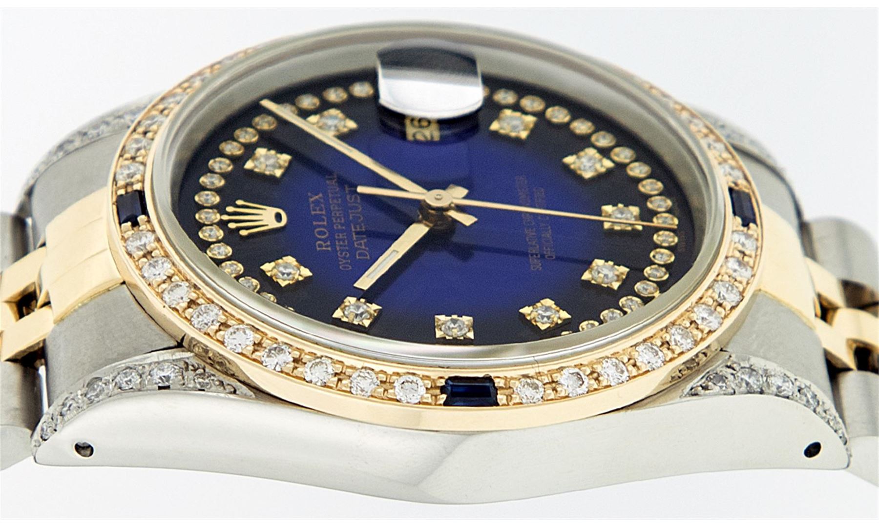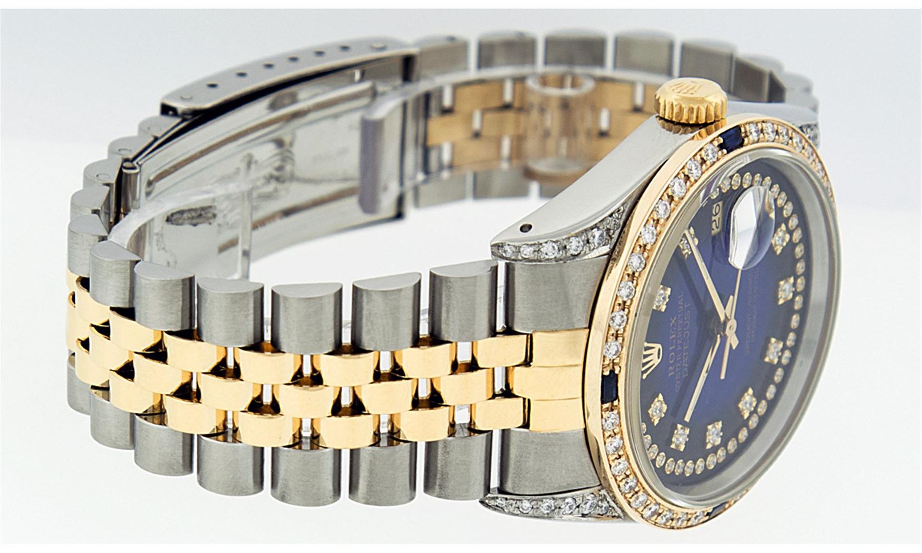 One Mens Two Tone Rolex Datejust Polished, Serviced & Electronically Tested,14K Yellow Gold And Stainless Steel Case:36mm, Diamond Lugs: Diamond Count: 24 Diamonds In Lugs, Diamond Weight: .35 Carat. Clarity SI-VS, Color: G to H. 14K Yellow Gold Crown, Custom Bezel: 18K Yellow Gold Sapphire Beadset Diamond Bezel. Diamond Count: 36 Diamonds + 4 Sapphires. Total Weight 1.0 Carat, Clarity: SI-VS, Color: G to H. Custom Crystal: Synthetic Sapphire Cyclops Lens. Movement: Automatic Winding Movement Caliber 3035. Custom Dial: Blue Vignette String Diamond Dial VVS, Diamond Count: 58 Diamonds In Dial, Clarity: SI-VS, Color: VVS. Date Window: 3 O'Clock Position Date Display, Quickset, Model: 16013 Condition: G-6 Extra Fine. Bracelet: 14K Yellow Gold And Stainless Steel Jubilee. Bright Polish & Satin Finish. 7.0 Inch Length, Adjustable. Standard Clasp, With Rolex Logo. Comes with 6 month warranty.