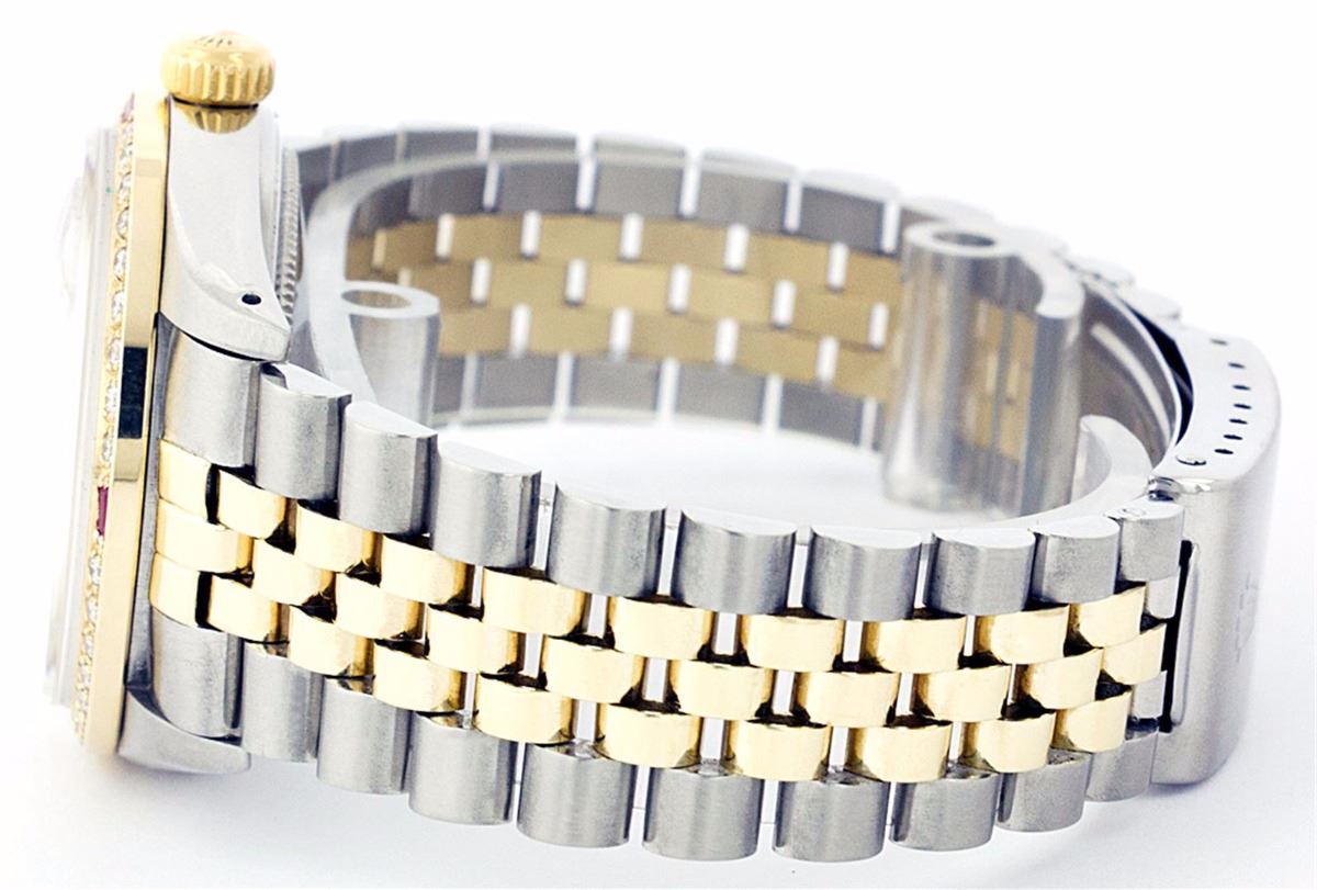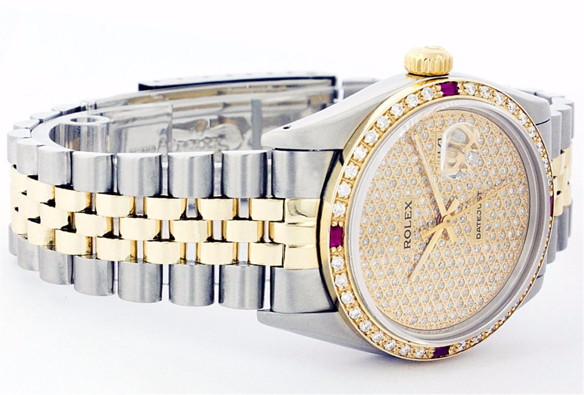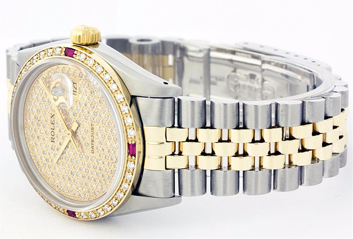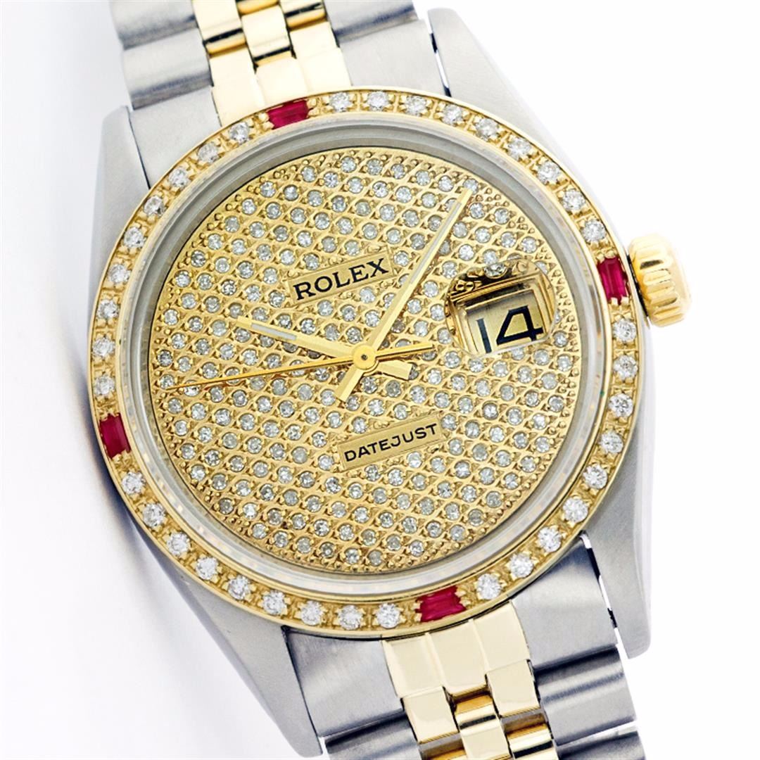 One Gents Two Tone Rolex Datejust Polished, Serviced & Electronically Tested, 14K Yellow Gold & Stainless Steel Case:36mm, 14K Yellow Gold Crown, Custom Bezel: 18K Yellow Gold Ruby Beadset Diamond Bezel, Diamond Count: 36 Diamonds + 4 Rubies Total Weight 1.00 Carat, Clarity: Si-VS, Color: G to H. Custom Crystal: Synthetic Sapphire Cyclops Lens. Movement: Automatic Winding Movement Caliber 3035. Custom Dial: Full Pave Diamond Dial with a total diamond weight of 1.00cts, G To H In Color, SI-VS Clarity. Date Window: 3 O'Clock Position Date Display, Quickset, Model: 16013 Condition: G-6 Extra Fine. Bracelet: Two Tone 14K Yellow Gold & Stainless Steel Jubilee. Bright Polish. 6.5 Inch Length, Adjustable. Standard Clasp, With Rolex Logo.