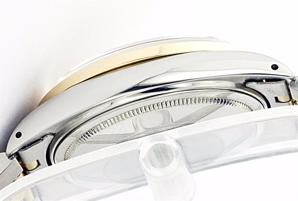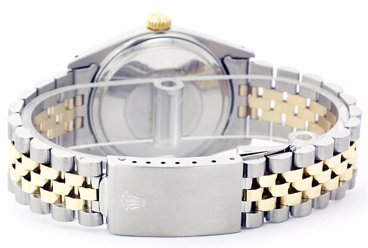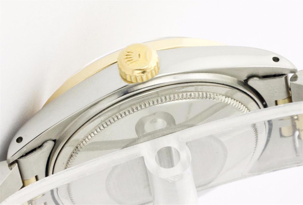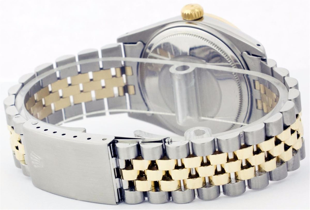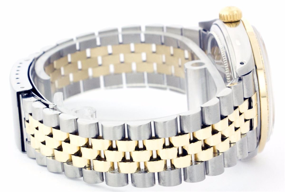 One Gents Two Tone Rolex Datejust Polished, Serviced & Electronically Tested, 14K Yellow Gold & Stainless Steel Case:36mm, 14K Yellow Gold Crown, Custom Bezel: 18K Yellow Gold Ruby Beadset Diamond Bezel, Diamond Count: 36 Diamonds + 4 Rubies Total Weight 1.00 Carat, Clarity: Si-VS, Color: G to H. Custom Crystal: Synthetic Sapphire Cyclops Lens. Movement: Automatic Winding Movement Caliber 3035. Custom Dial: Full Pave Diamond Dial with a total diamond weight of 1.00cts, G To H In Color, SI-VS Clarity. Date Window: 3 O'Clock Position Date Display, Quickset, Model: 16013 Condition: G-6 Extra Fine. Bracelet: Two Tone 14K Yellow Gold & Stainless Steel Jubilee. Bright Polish. 6.5 Inch Length, Adjustable. Standard Clasp, With Rolex Logo.