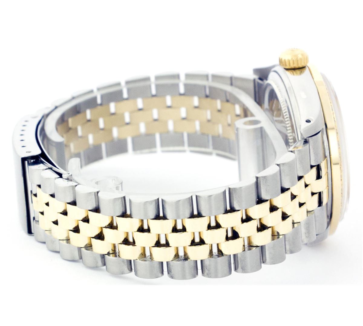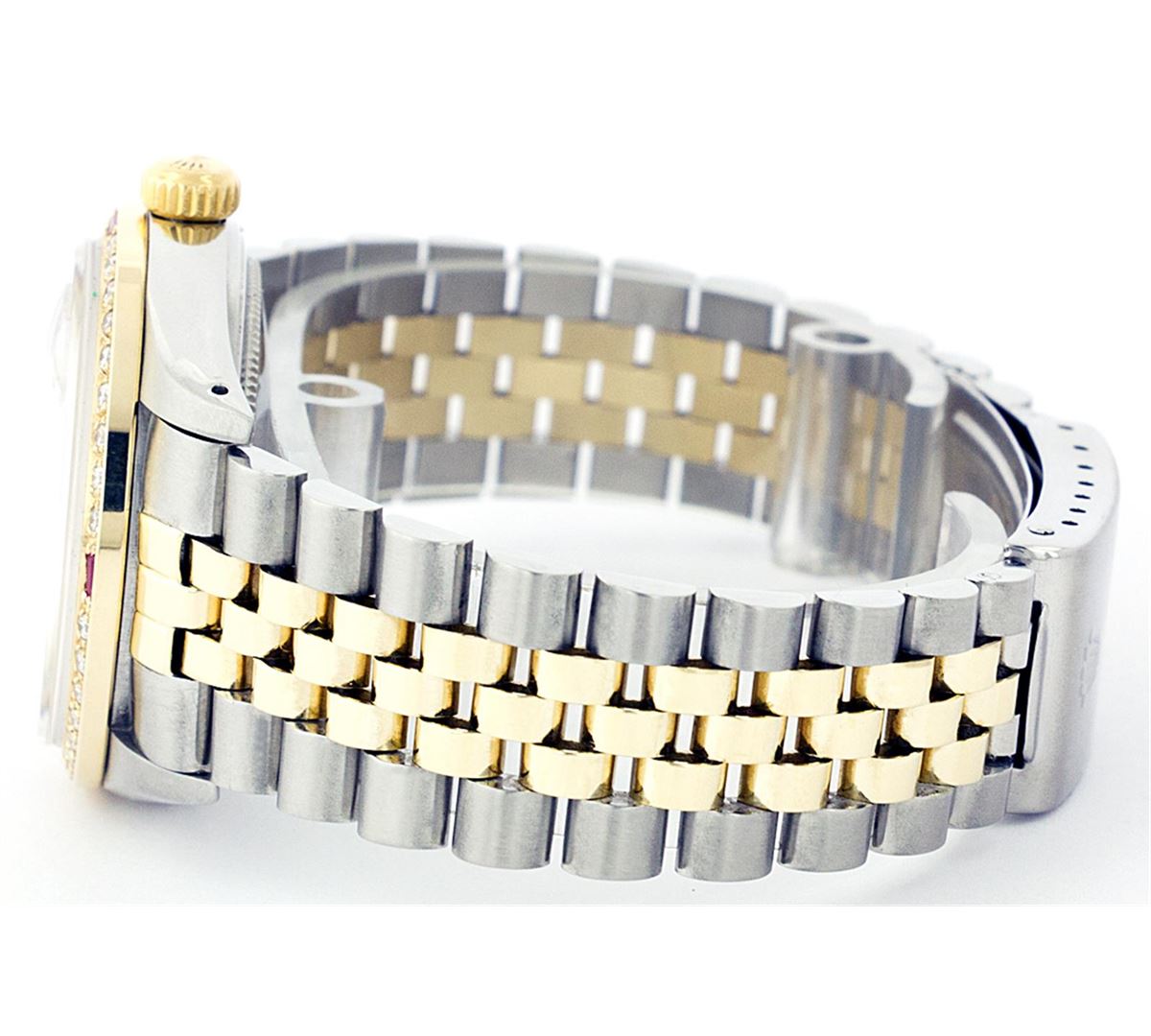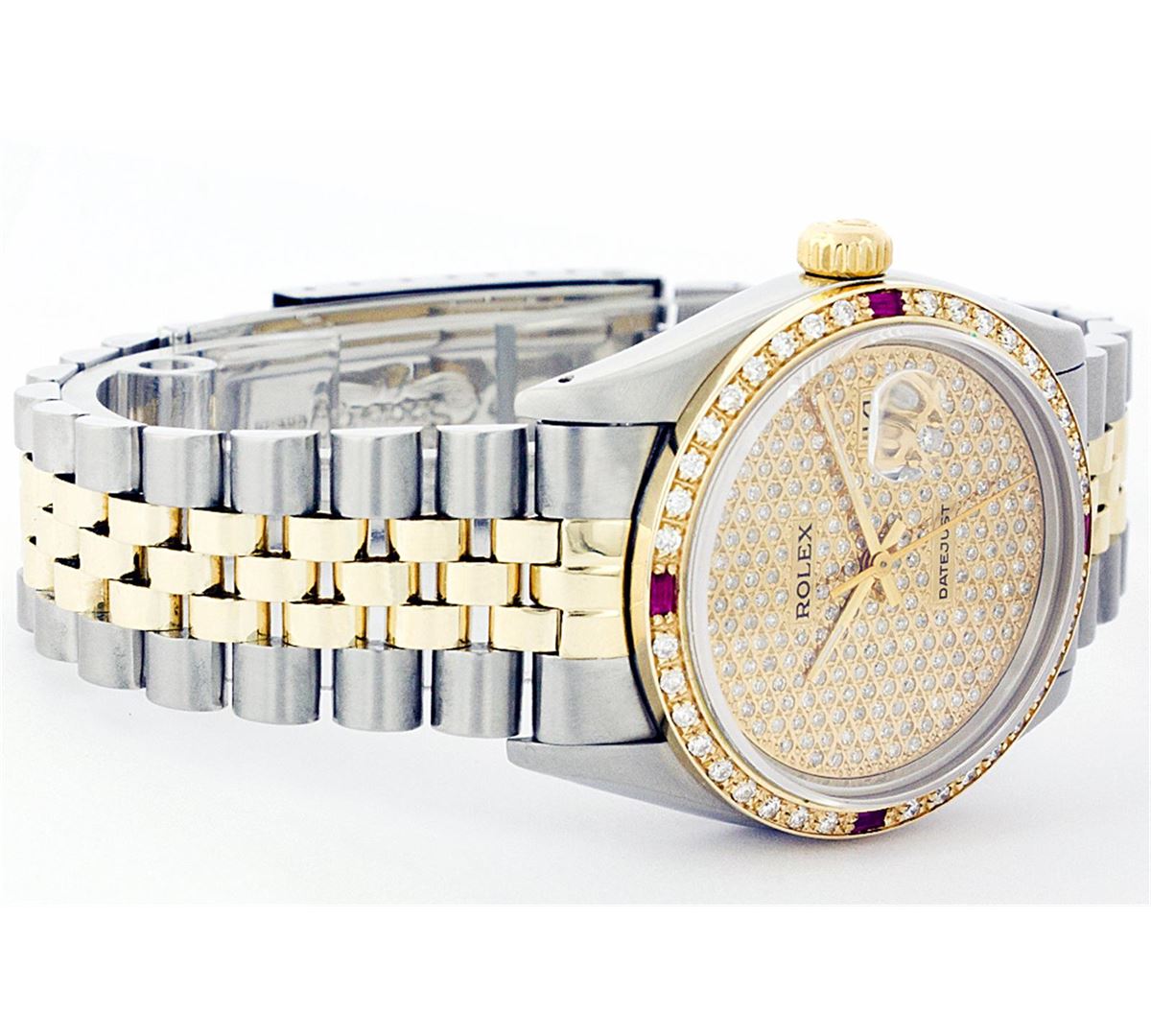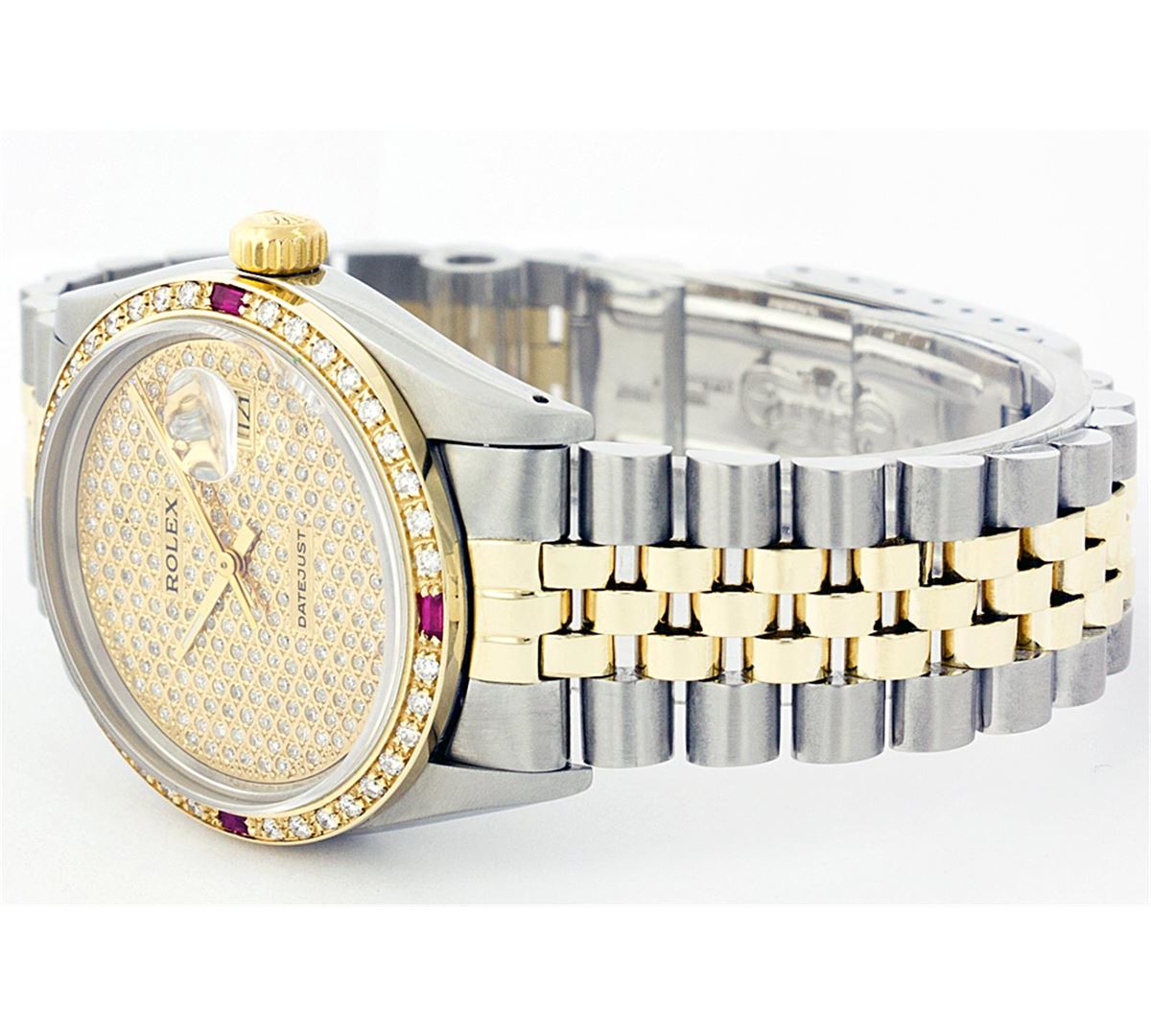 One Gents Two Tone Rolex Datejust Polished, Serviced & Electronically Tested, 14K Yellow Gold & Stainless Steel Case:36mm, 14K Yellow Gold Crown, Custom Bezel: 18K Yellow Gold Ruby Beadset Diamond Bezel, Diamond Count: 36 Diamonds + 4 Rubies Total Weight 1.00 Carat, Clarity: Si-VS, Color: G to H. Custom Crystal: Synthetic Sapphire Cyclops Lens. Movement: Automatic Winding Movement Caliber 3035. Custom Dial: Full Pave Diamond Dial with a total diamond weight of 1.00cts, G To H In Color, SI-VS Clarity. Date Window: 3 O'Clock Position Date Display, Quickset, Model: 16013 Condition: G-6 Extra Fine. Bracelet: Two Tone 14K Yellow Gold & Stainless Steel Jubilee. Bright Polish. 6.5 Inch Length, Adjustable. Standard Clasp, With Rolex Logo.