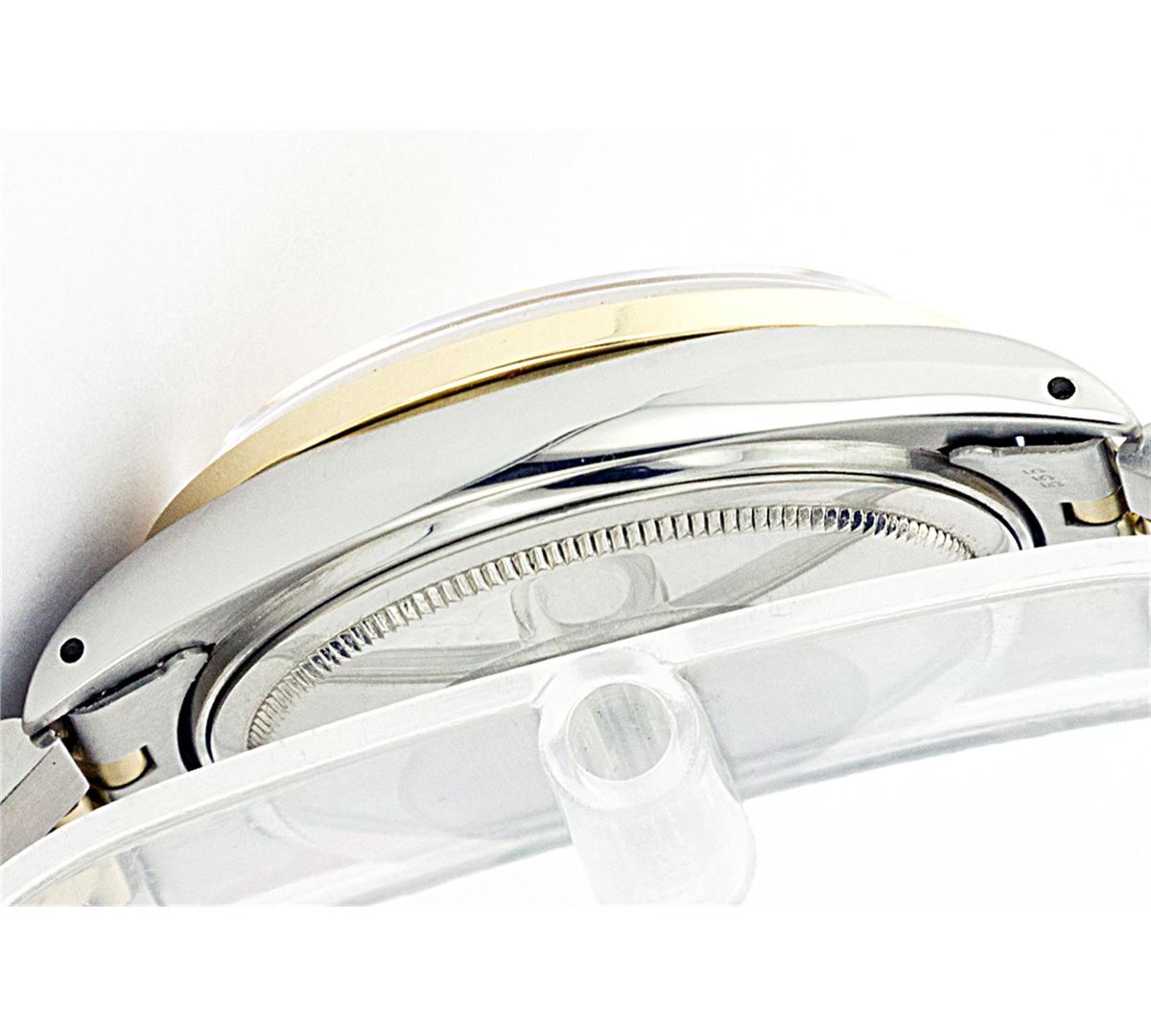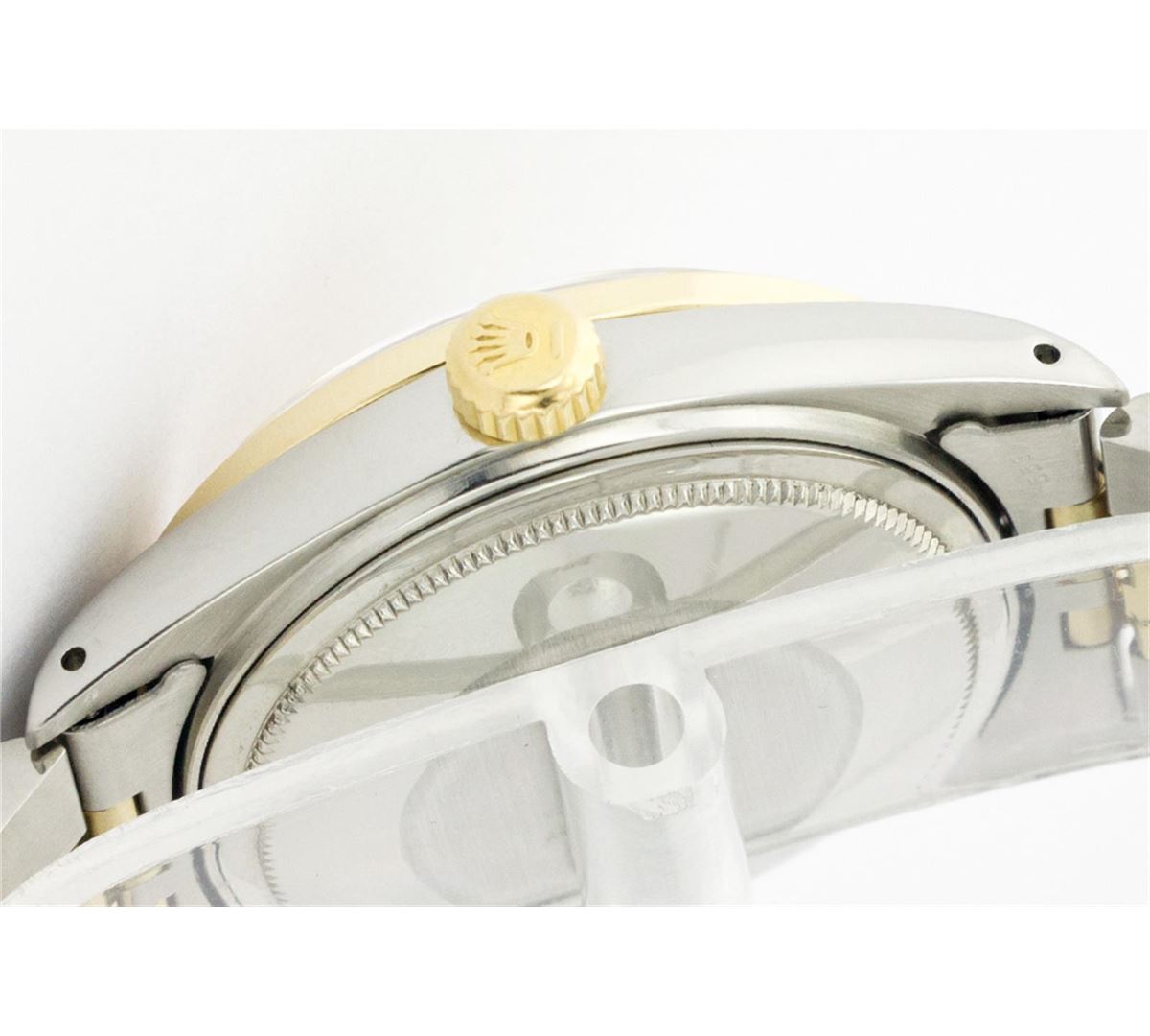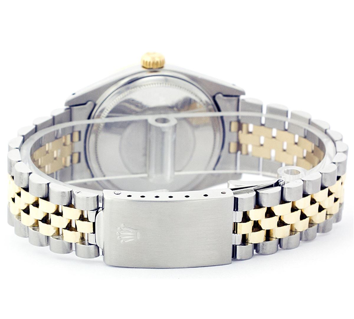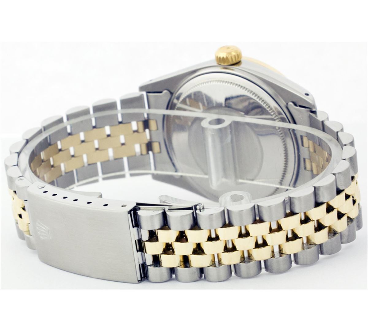 One Gents Two Tone Rolex Datejust Polished, Serviced & Electronically Tested, 14K Yellow Gold & Stainless Steel Case:36mm, 14K Yellow Gold Crown, Custom Bezel: 18K Yellow Gold Ruby Beadset Diamond Bezel, Diamond Count: 36 Diamonds + 4 Rubies Total Weight 1.00 Carat, Clarity: Si-VS, Color: G to H. Custom Crystal: Synthetic Sapphire Cyclops Lens. Movement: Automatic Winding Movement Caliber 3035. Custom Dial: Full Pave Diamond Dial with a total diamond weight of 1.00cts, G To H In Color, SI-VS Clarity. Date Window: 3 O'Clock Position Date Display, Quickset, Model: 16013 Condition: G-6 Extra Fine. Bracelet: Two Tone 14K Yellow Gold & Stainless Steel Jubilee. Bright Polish. 6.5 Inch Length, Adjustable. Standard Clasp, With Rolex Logo.