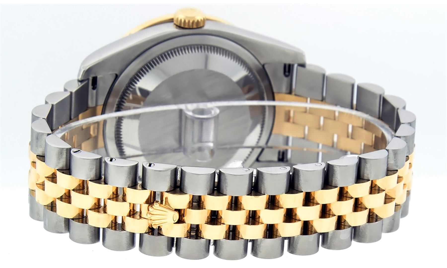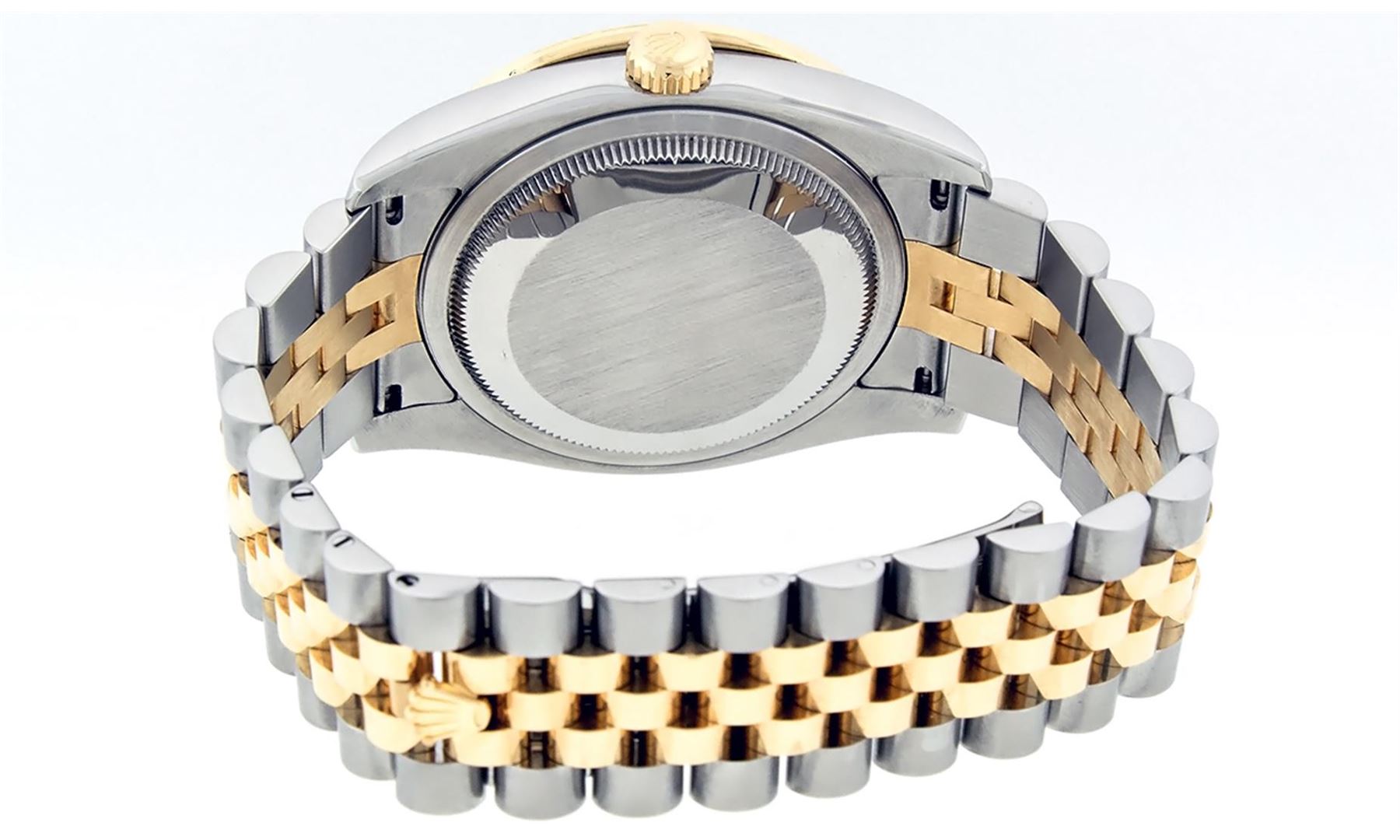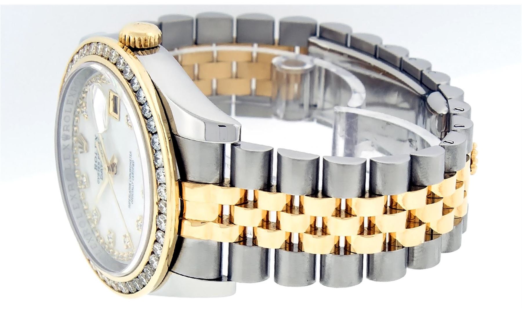 One Gents 18K Yellow Gold Two Tone Rolex Datejust Polished, Serviced & Electronically Tested, 18K Yellow Gold & Stainless Steel Case:36mm, 18K Yellow Gold Crown, Custom Bezel: 18K Yellow Gold Channel Set Diamond Bezel, Diamond Count: 45 Diamonds In Bezel. Total Weight 2.30 Carat, Clarity: Si-VS, Color: G to H. Custom Crystal: Synthetic Sapphire Cyclops Lens. Movement: Automatic Winding Movement Caliber 3135. Custom Dial: Mother Of Pearl String Diamond Dial Single Cut VVS, Diamond Count: 58 Diamonds In Dial, Color: G To H, Clarity: VVS, Date Window: 3 O'Clock Position Date Display, Quickset, Model: 16233 Condition: G-6 Extra Fine The Watch Is In Very Good Condition Free Of All Scratches And Dents. Bracelet: Two Tone 18K Yellow Gold Hidden Clasp New Style Jubilee Band. Bright Polish. 7.0 Inch Length, Adjustable. Standard Clasp, With Rolex Logo. Comes with 6 month warranty.