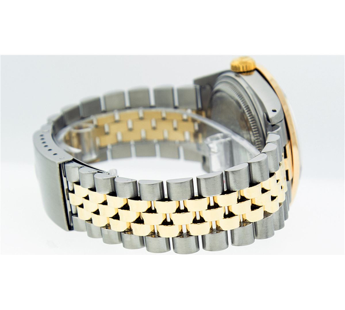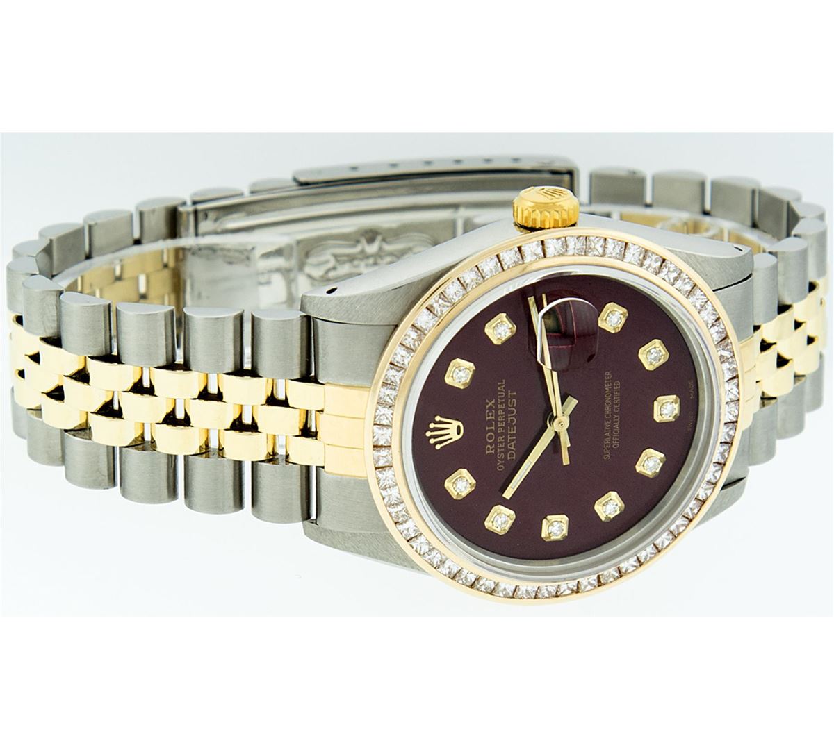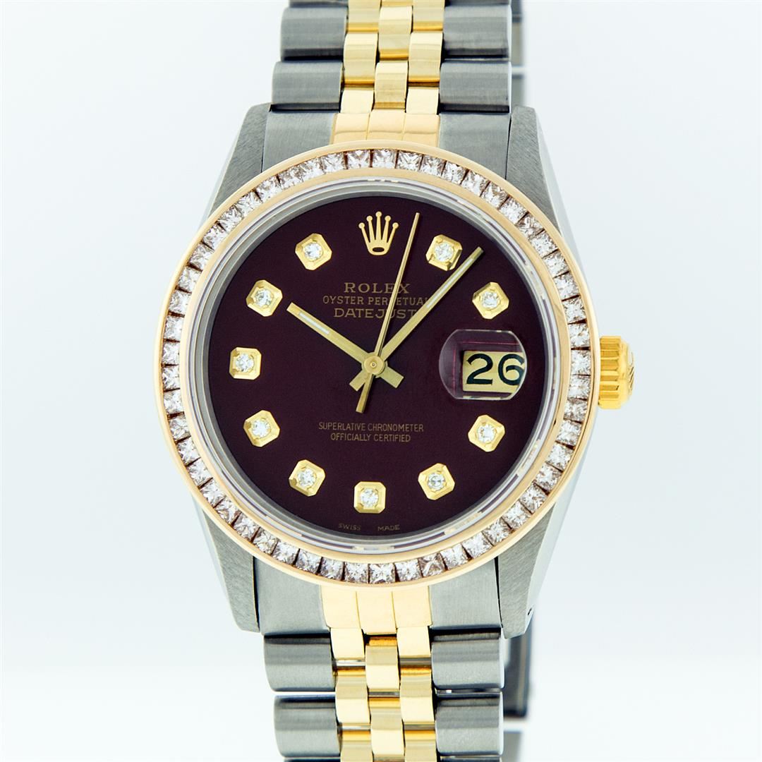One Mens Rolex Datejust Polished Bright with Satin Finish, Serviced & Electronically Tested, 14K Yellow Gold And Stainless Steel Case:36mm, Stainless Steel Crown, Custom Bezel: 14K Yellow Gold Princess Cut Diamond Bezel, Diamond Count: 53 Diamonds, Total Weight 2.75 Carat, Clarity: SI-VS, Color: G to H. Custom Crystal: Synthetic Sapphire Cyclops Lens. Movement: Automatic Winding Movement Caliber 3035. Custom Dial: Maroon Diamond Single Cut VVS, Diamond Count: 10 Diamond in Dial, Dial Color: G To H In Color, Clarity: VVS. Date Window: 3 O'Clock Position Date Display, Quickset, Model: 16013 Condition: G-6 Extra Fine. Bracelet: 14K Yellow Gold And Stainless Steel Jubilee. Bright Polish & Satin Finish. 7.0 Inch Length, Adjustable. Standard Clasp, With Rolex Logo. Comes with 6 month warranty.