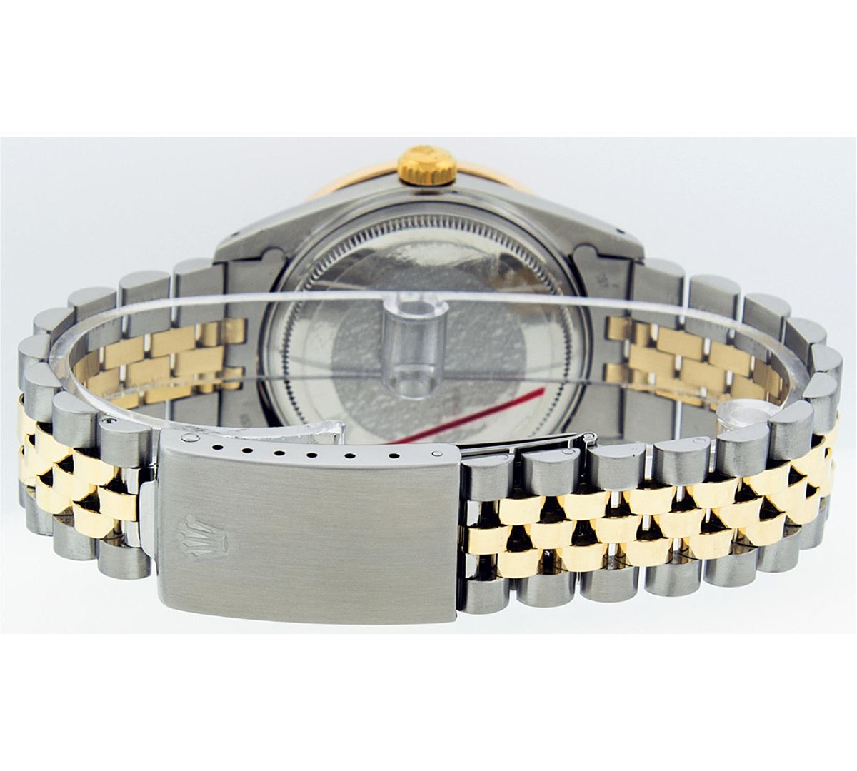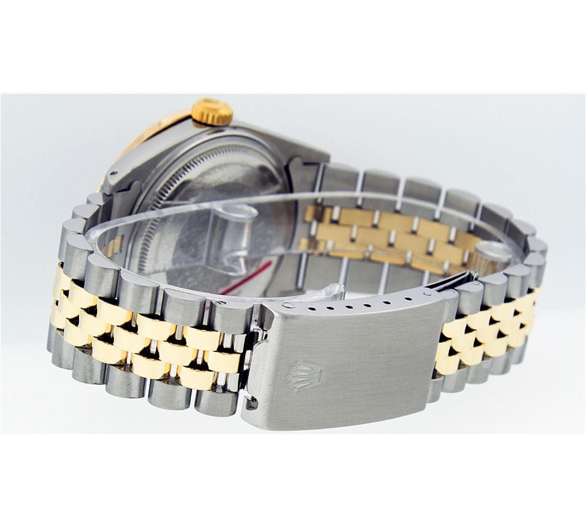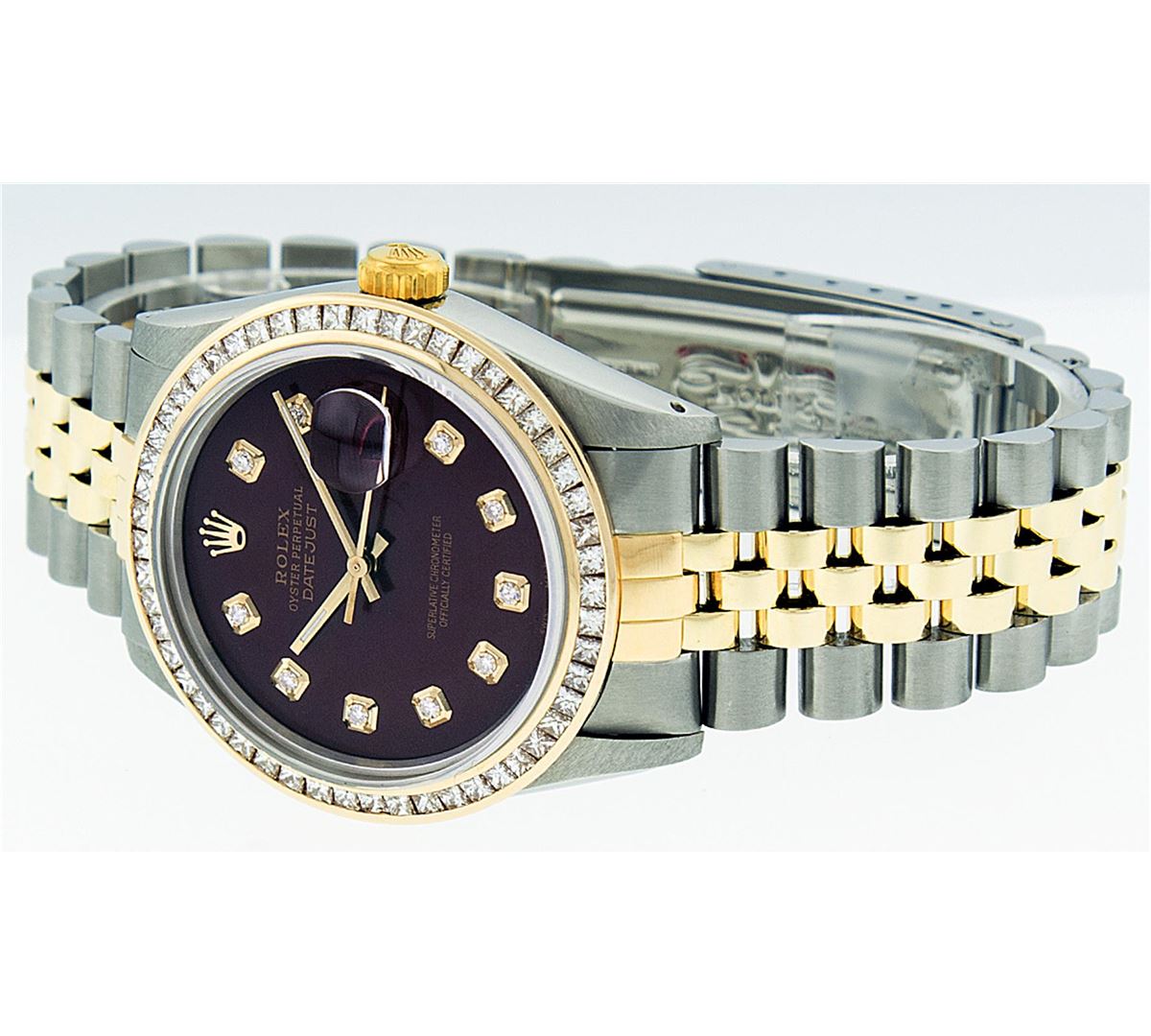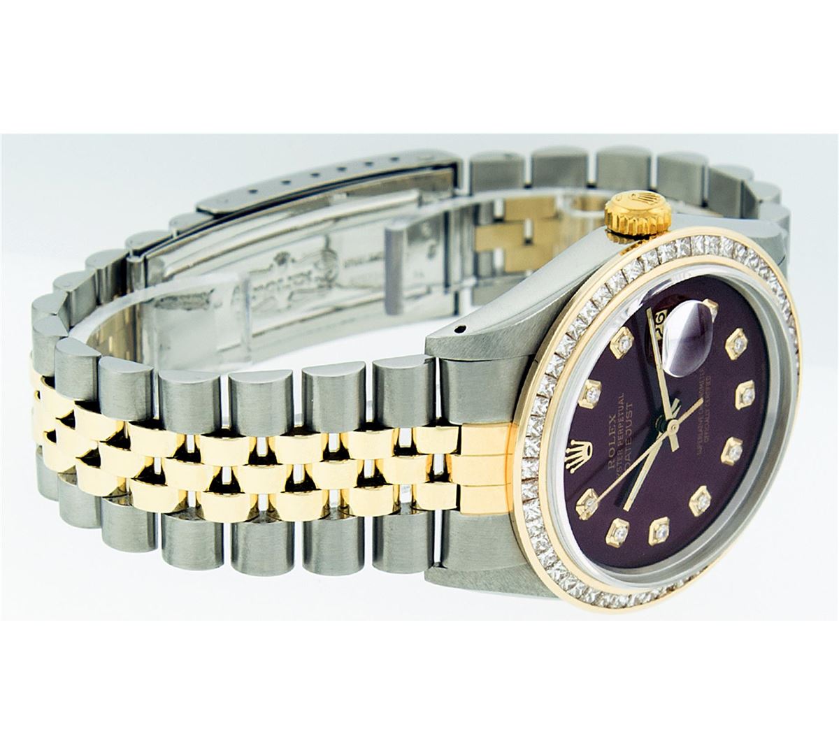 One Mens Rolex Datejust Polished Bright with Satin Finish, Serviced & Electronically Tested, 14K Yellow Gold And Stainless Steel Case:36mm, Stainless Steel Crown, Custom Bezel: 14K Yellow Gold Princess Cut Diamond Bezel, Diamond Count: 53 Diamonds, Total Weight 2.75 Carat, Clarity: SI-VS, Color: G to H. Custom Crystal: Synthetic Sapphire Cyclops Lens. Movement: Automatic Winding Movement Caliber 3035. Custom Dial: Maroon Diamond Single Cut VVS, Diamond Count: 10 Diamond in Dial, Dial Color: G To H In Color, Clarity: VVS. Date Window: 3 O'Clock Position Date Display, Quickset, Model: 16013 Condition: G-6 Extra Fine. Bracelet: 14K Yellow Gold And Stainless Steel Jubilee. Bright Polish & Satin Finish. 7.0 Inch Length, Adjustable. Standard Clasp, With Rolex Logo. Comes with 6 month warranty.