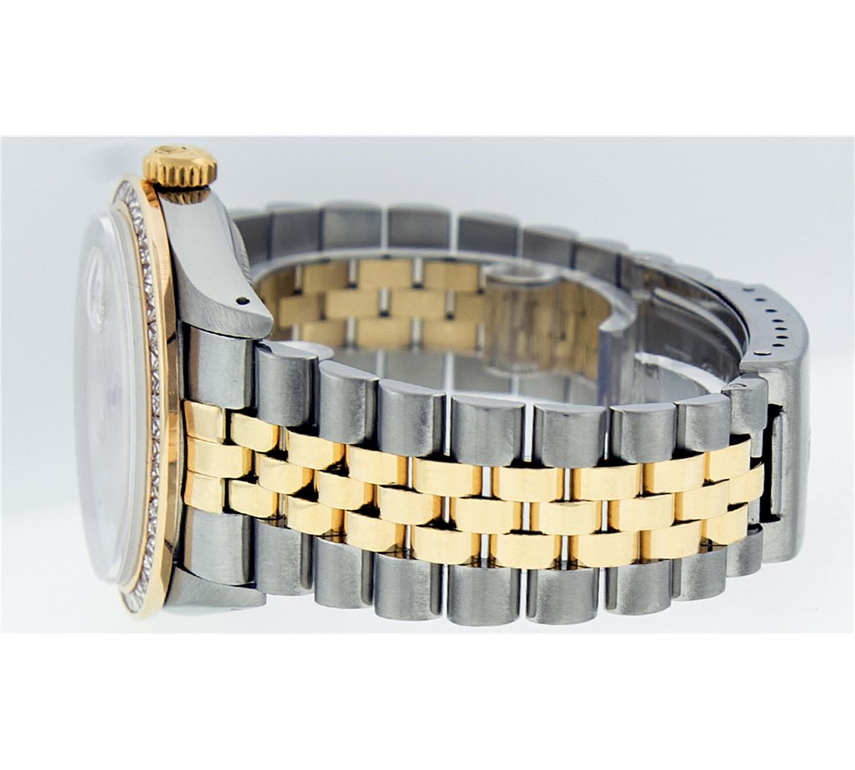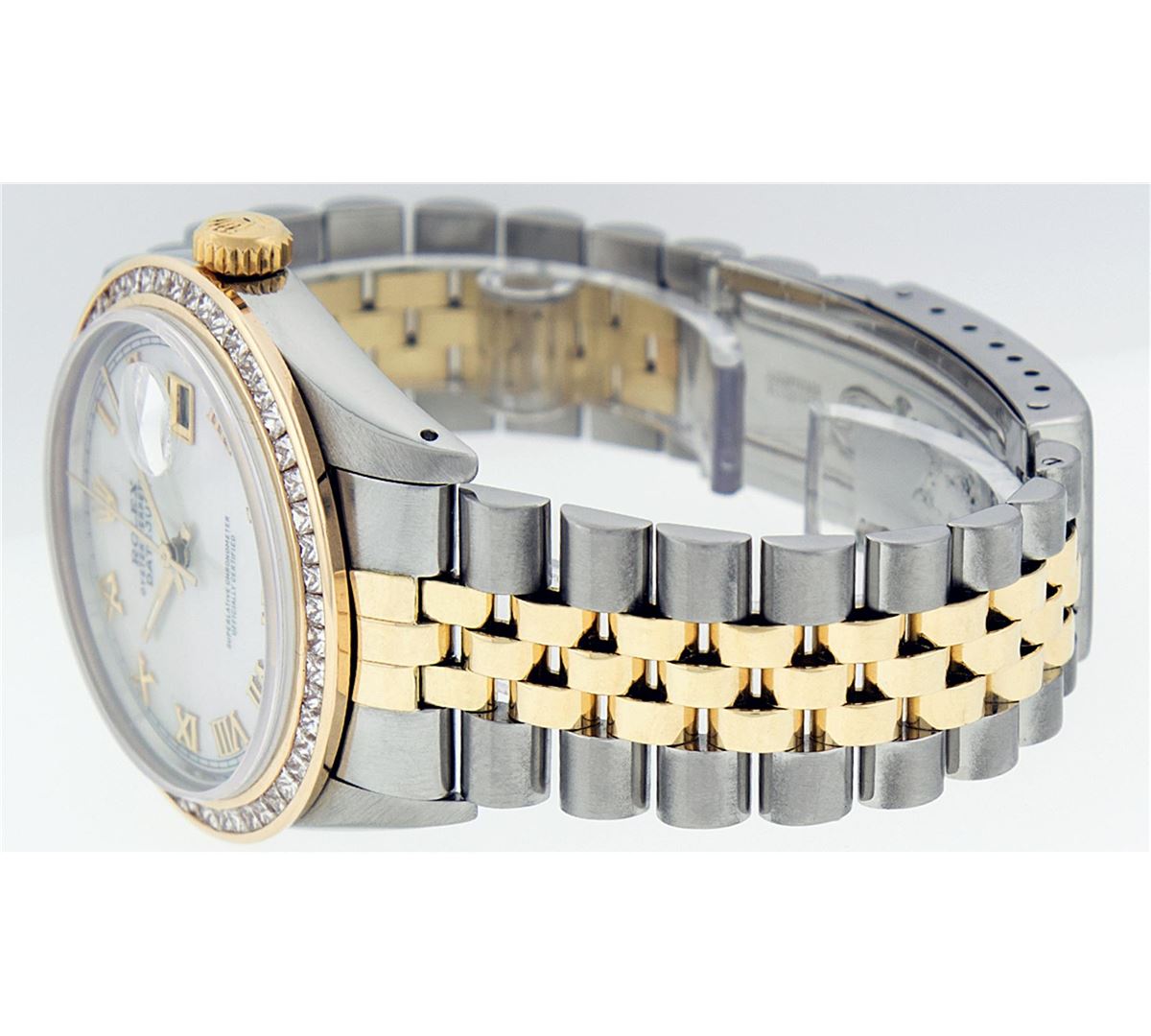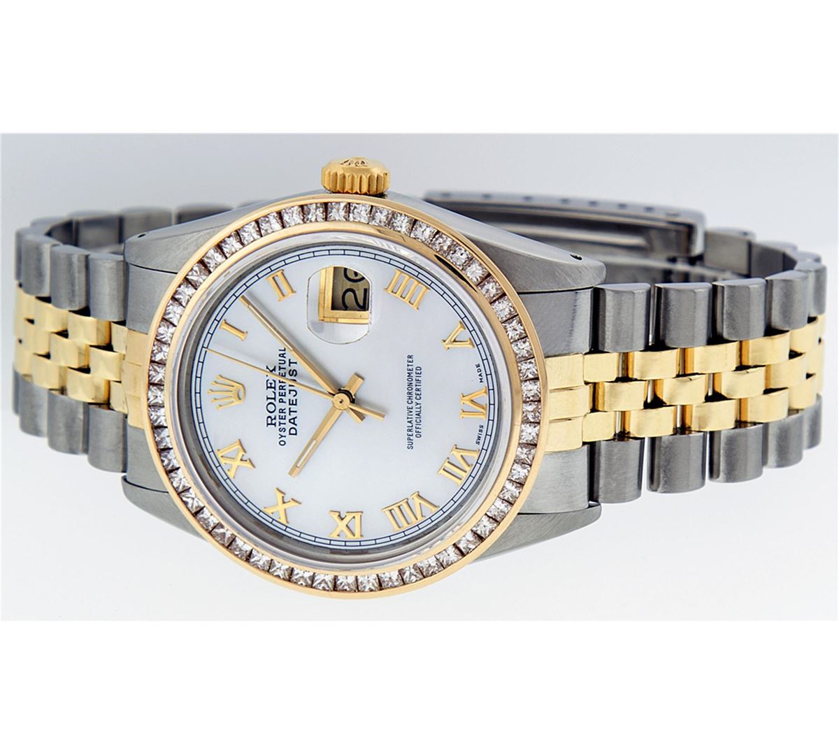 One Mens Two Tone Rolex Datejust Polished Bright with Satin Finish, Serviced & Electronically Tested, 14K Yellow Gold And Stainless Steel Case:36mm, 14K Yellow Gold Crown, Custom Bezel: 14K Yellow Gold Princess Cut Diamond Bezel, Diamond Count: 53 Diamonds, Total Weight 2.75 Carat, Clarity: SI-VS, Color: G to H. Custom Crystal: Synthetic Sapphire Cyclops Lens. Movement: Automatic Winding Movement Caliber 3035. Custom Dial: Mother Of Pearl Roman Dial. Date Window: 3 O'Clock Position Date Display, Quickset, Model: 16013 Condition: G-6 Extra Fine. Bracelet: 14K Yellow Gold And Stainless Steel Jubilee. Bright Polish & Satin Finish. 7.0 Inch Length, Adjustable. Standard Clasp, With Rolex Logo.