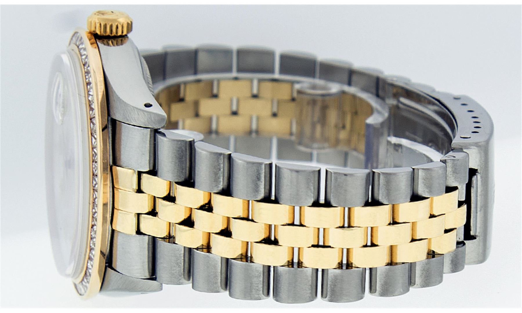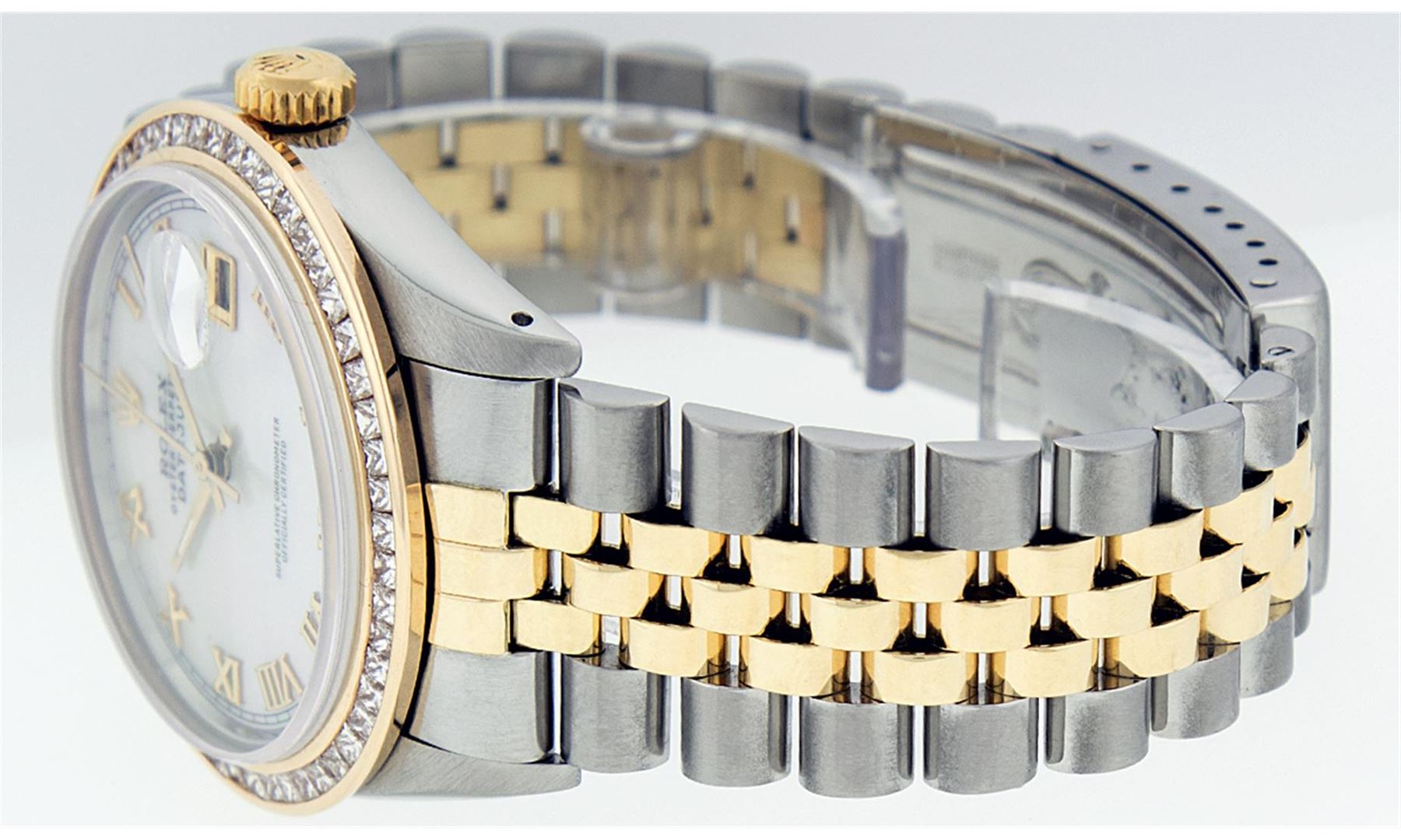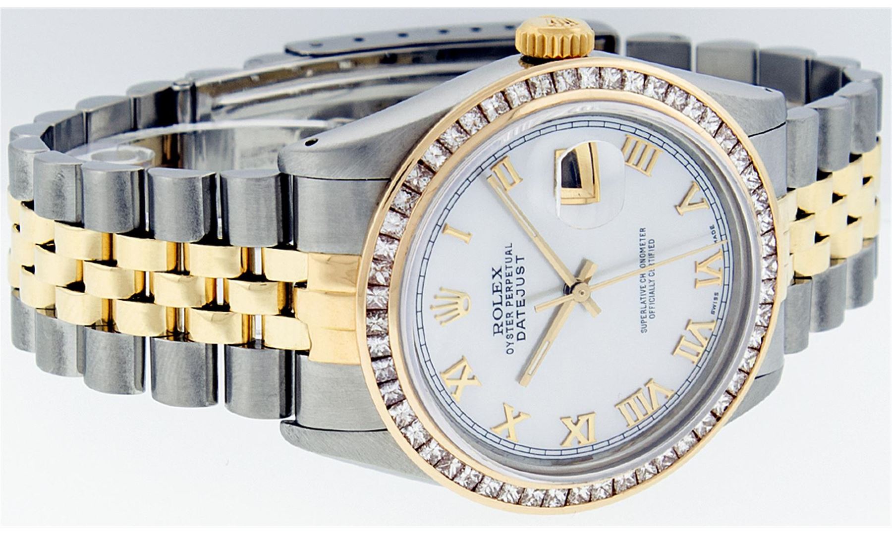 One Mens Two Tone Rolex Datejust Polished Bright with Satin Finish, Serviced & Electronically Tested, 14K Yellow Gold And Stainless Steel Case:36mm, 14K Yellow Gold Crown, Custom Bezel: 14K Yellow Gold Princess Cut Diamond Bezel, Diamond Count: 53 Diamonds, Total Weight 2.75 Carat, Clarity: SI-VS, Color: G to H. Custom Crystal: Synthetic Sapphire Cyclops Lens. Movement: Automatic Winding Movement Caliber 3035. Custom Dial: Mother Of Pearl Roman Dial. Date Window: 3 O'Clock Position Date Display, Quickset, Model: 16013 Condition: G-6 Extra Fine. Bracelet: 14K Yellow Gold And Stainless Steel Jubilee. Bright Polish & Satin Finish. 7.0 Inch Length, Adjustable. Standard Clasp, With Rolex Logo.