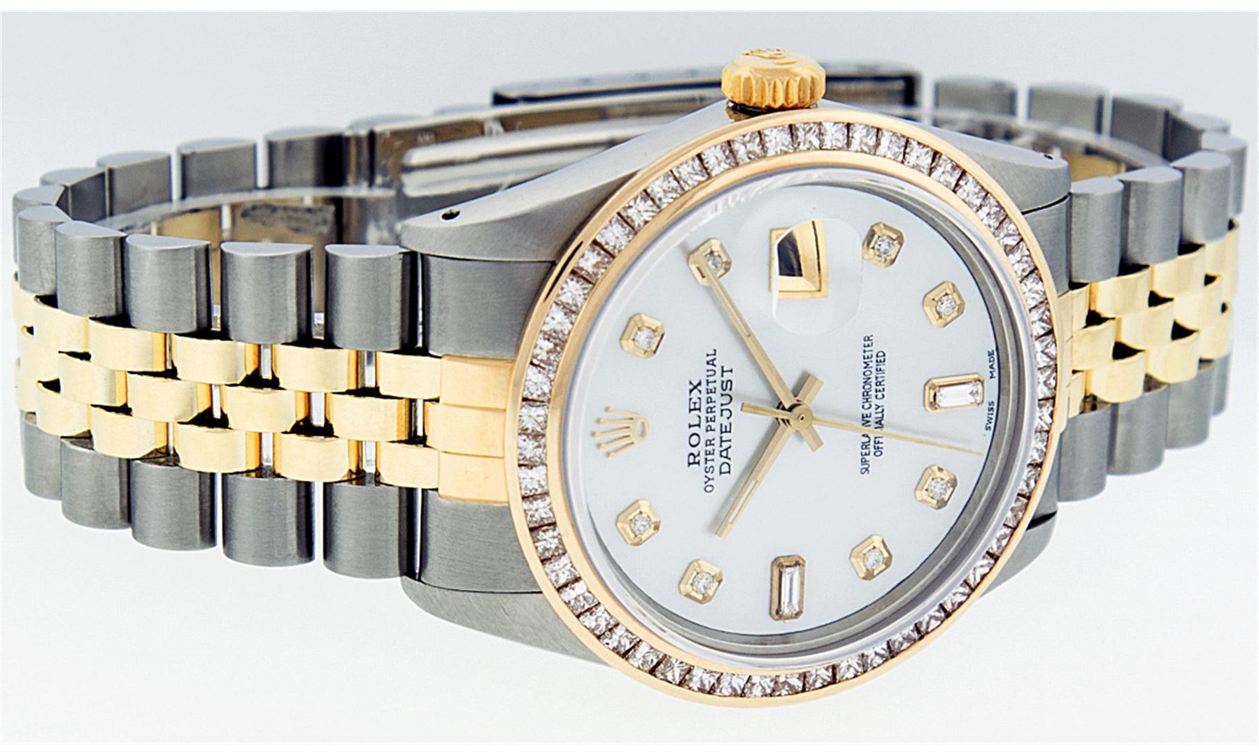 One Mens Two Tone Rolex Datejust Polished Bright with Satin Finish, Serviced & Electronically Tested, 14K Yellow Gold And Stainless Steel Case:36mm, 14K Yellow Gold Crown, Custom Bezel: 14K Yellow Gold Princess Cut Diamond Bezel, Diamond Count: 53 Diamonds, Total Weight 2.75 Carat, Clarity: SI-VS, Color: G to H. Custom Crystal: Synthetic Sapphire Cyclops Lens. Movement: Automatic Winding Movement Caliber 3035. Custom Dial: Mother Of Pearl 8 + 2 Diamond Dial, Diamond Count: 8 Diamonds in Dial + 2 Baguettes, Diamond Color: G To H In Color, Clarity: VS2-SI1. Date Window: 3 O'Clock Position Date Display, Quickset, Model: 16013 Condition: G-6 Extra Fine. Bracelet: 14K Yellow Gold And Stainless Steel Jubilee. Bright Polish & Satin Finish. 7.0 Inch Length, Adjustable. Standard Clasp, With Rolex Logo. Comes with 6 month warranty.
