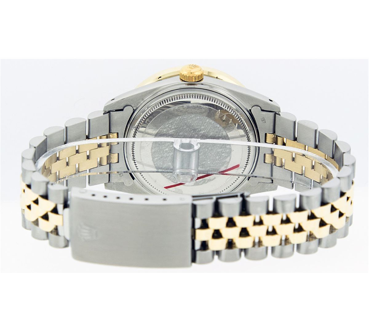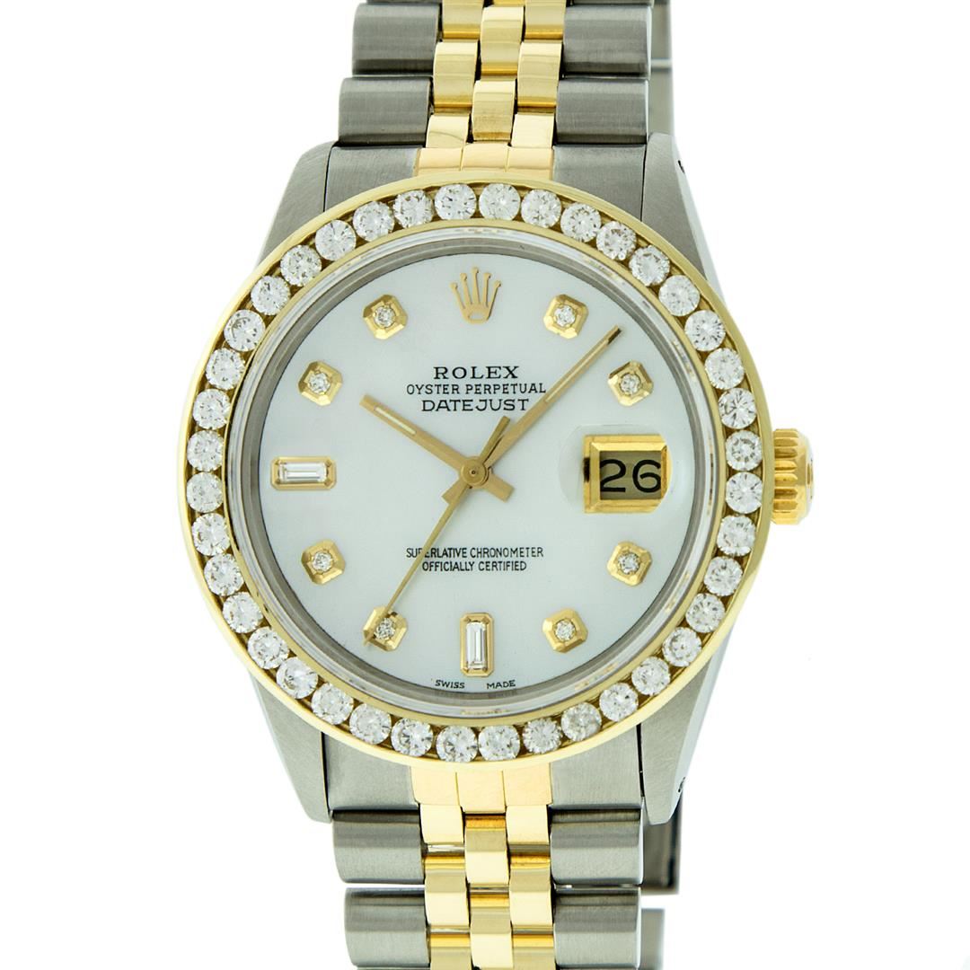 One Mens Rolex Datejust Polished Bright with Satin Finish, Serviced & Electronically Tested, 14K Yellow Gold And Stainless Steel Case:36mm, Stainless Steel Crown, Custom Bezel: 18K Yellow Gold Channel Set Diamond Bezel, Diamond Count: 40 Diamonds, Total Weight 3.00 Carat, Clarity: SI-VS, Color: G to H. Custom Crystal: Synthetic Sapphire Cyclops Lens. Movement: Automatic Winding Movement Caliber 3035. Custom Dial: Mother Of Pearl Diamond, Diamond Count: 8 Diamond + 2 Baguettes in Dial, Dial Color: G To H In Color, Clarity: SI-VS. Date Window: 3 O'Clock Position Date Display, Quickset, Model: 16013 Condition: G-6 Extra Fine. Bracelet: 14K Yellow Gold And Stainless Steel Jubilee. Bright Polish & Satin Finish. 7.0 Inch Length, Adjustable. Standard Clasp, With Rolex Logo. Comes with 6 month warranty.