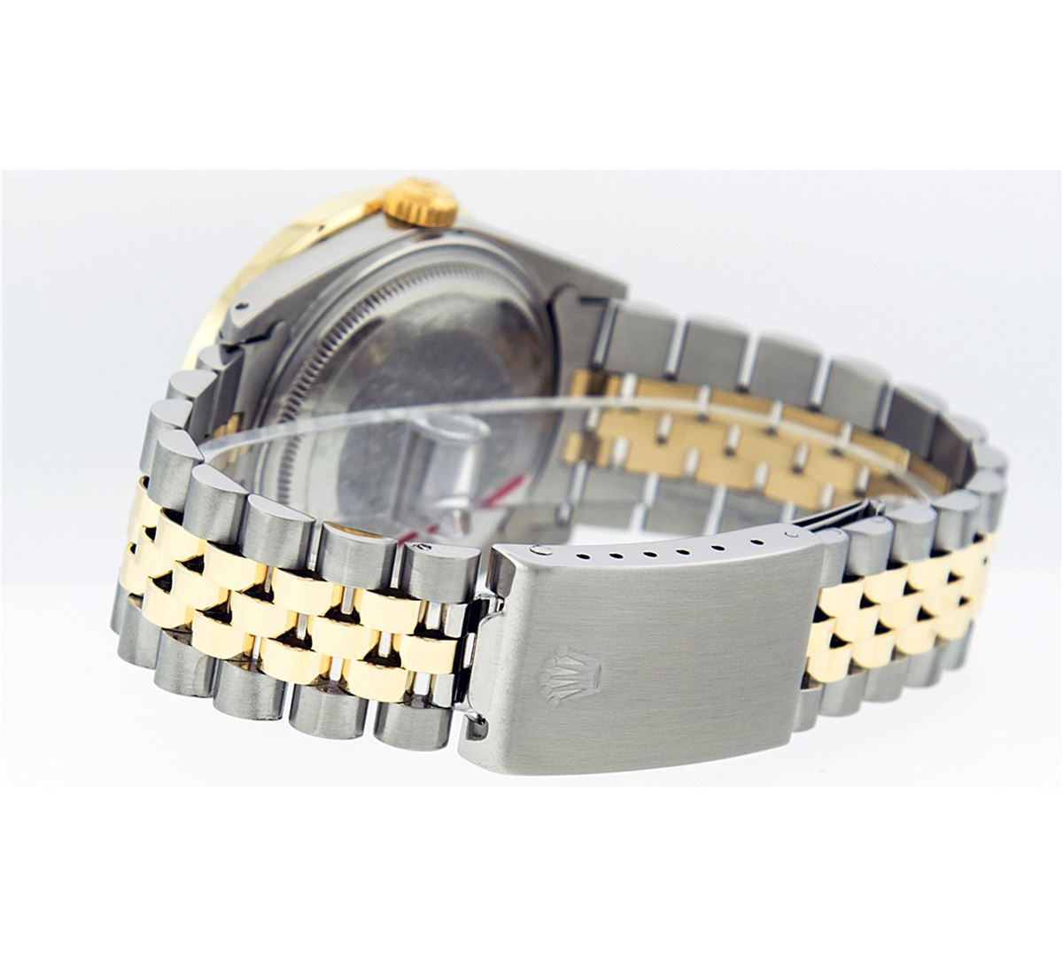 One Mens Rolex Datejust Polished Bright with Satin Finish, Serviced & Electronically Tested, 14K Yellow Gold And Stainless Steel Case:36mm, Stainless Steel Crown, Custom Bezel: 18K Yellow Gold Channel Set Diamond Bezel, Diamond Count: 40 Diamonds, Total Weight 3.00 Carat, Clarity: SI-VS, Color: G to H. Custom Crystal: Synthetic Sapphire Cyclops Lens. Movement: Automatic Winding Movement Caliber 3035. Custom Dial: Maroon Diamond Single Cut VVS, Diamond Count: 10 Diamond in Dial, Dial Color: G To H In Color, Clarity: VVS. Date Window: 3 O'Clock Position Date Display, Quickset, Model: 16013 Condition: G-6 Extra Fine. Bracelet: 14K Yellow Gold And Stainless Steel Jubilee. Bright Polish & Satin Finish. 7.0 Inch Length, Adjustable. Standard Clasp, With Rolex Logo. Comes with 6 month warranty.