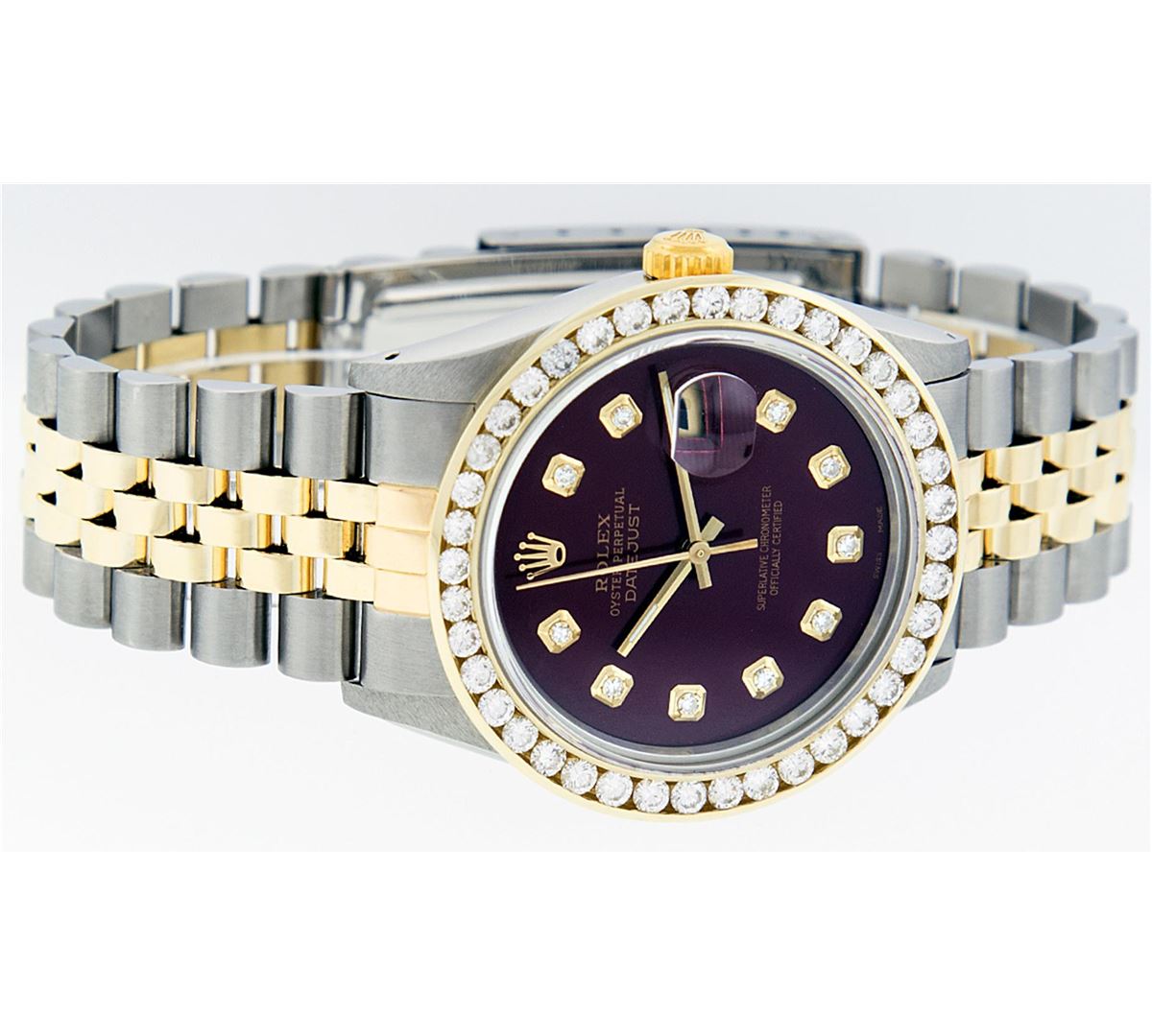 One Mens Rolex Datejust Polished Bright with Satin Finish, Serviced & Electronically Tested, 14K Yellow Gold And Stainless Steel Case:36mm, Stainless Steel Crown, Custom Bezel: 18K Yellow Gold Channel Set Diamond Bezel, Diamond Count: 40 Diamonds, Total Weight 3.00 Carat, Clarity: SI-VS, Color: G to H. Custom Crystal: Synthetic Sapphire Cyclops Lens. Movement: Automatic Winding Movement Caliber 3035. Custom Dial: Maroon Diamond Single Cut VVS, Diamond Count: 10 Diamond in Dial, Dial Color: G To H In Color, Clarity: VVS. Date Window: 3 O'Clock Position Date Display, Quickset, Model: 16013 Condition: G-6 Extra Fine. Bracelet: 14K Yellow Gold And Stainless Steel Jubilee. Bright Polish & Satin Finish. 7.0 Inch Length, Adjustable. Standard Clasp, With Rolex Logo. Comes with 6 month warranty.