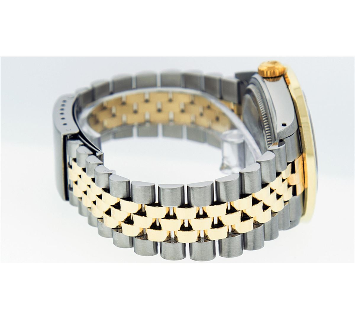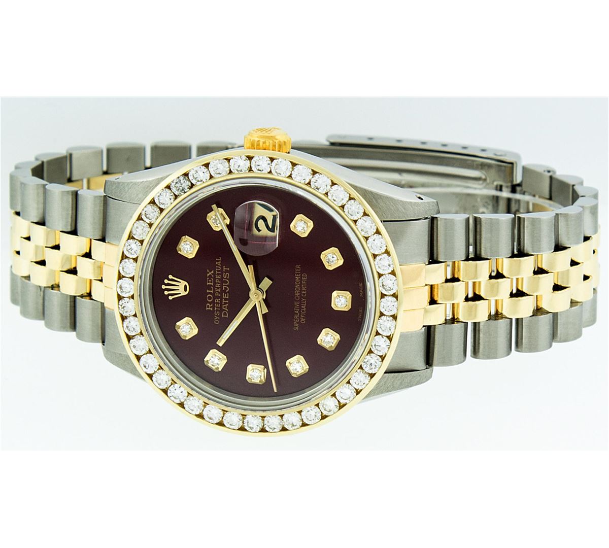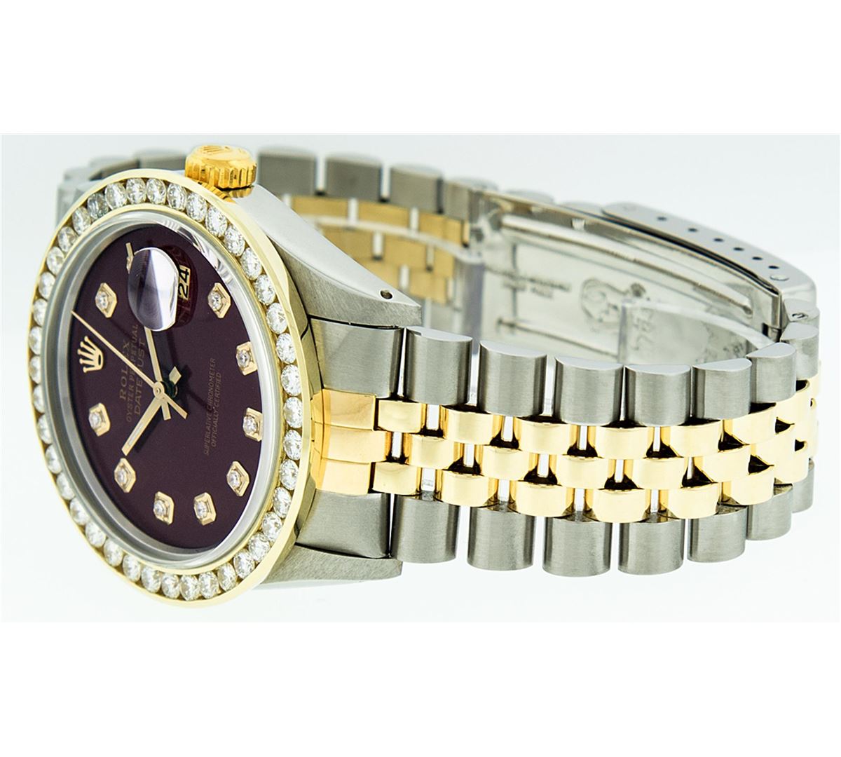 One Mens Rolex Datejust Polished Bright with Satin Finish, Serviced & Electronically Tested, 14K Yellow Gold And Stainless Steel Case:36mm, Stainless Steel Crown, Custom Bezel: 18K Yellow Gold Channel Set Diamond Bezel, Diamond Count: 40 Diamonds, Total Weight 3.00 Carat, Clarity: SI-VS, Color: G to H. Custom Crystal: Synthetic Sapphire Cyclops Lens. Movement: Automatic Winding Movement Caliber 3035. Custom Dial: Maroon Diamond Single Cut VVS, Diamond Count: 10 Diamond in Dial, Dial Color: G To H In Color, Clarity: VVS. Date Window: 3 O'Clock Position Date Display, Quickset, Model: 16013 Condition: G-6 Extra Fine. Bracelet: 14K Yellow Gold And Stainless Steel Jubilee. Bright Polish & Satin Finish. 7.0 Inch Length, Adjustable. Standard Clasp, With Rolex Logo. Comes with 6 month warranty.