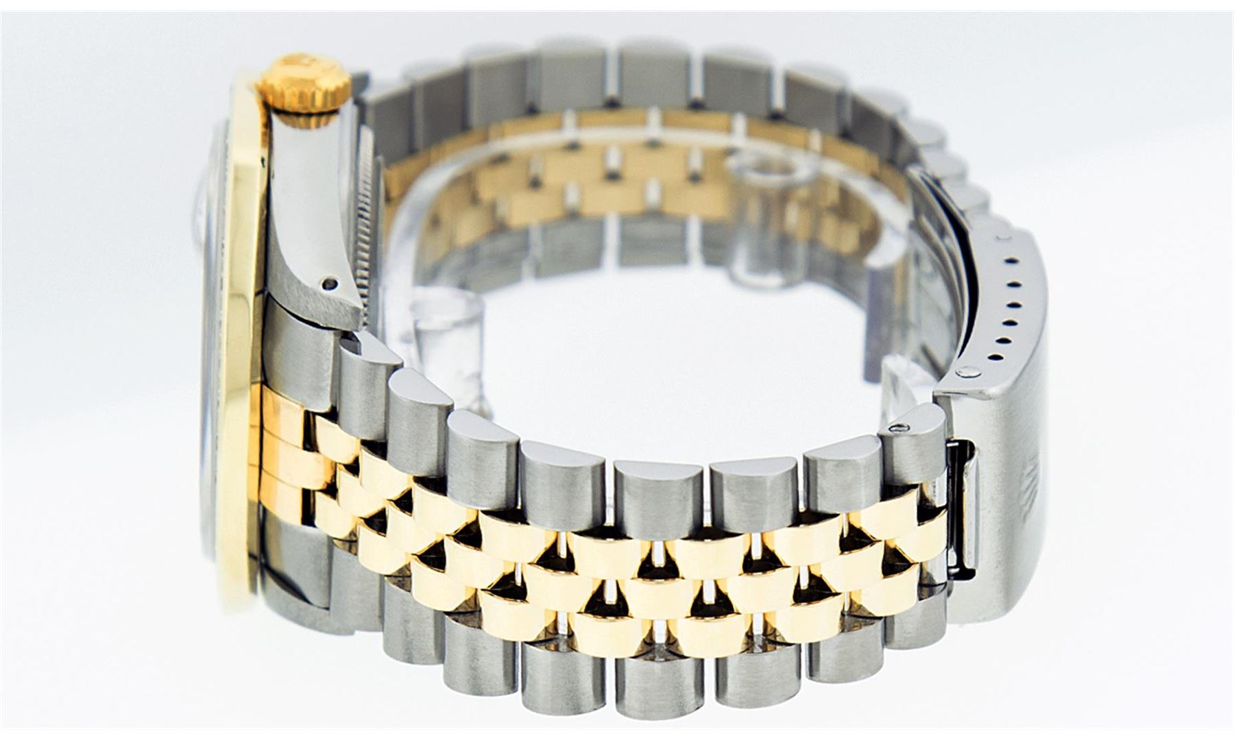 One Mens Rolex Datejust Polished Bright with Satin Finish, Serviced & Electronically Tested, 14K Yellow Gold And Stainless Steel Case:36mm, Stainless Steel Crown, Custom Bezel: 18K Yellow Gold Channel Set Diamond Bezel, Diamond Count: 40 Diamonds, Total Weight 3.00 Carat, Clarity: SI-VS, Color: G to H. Custom Crystal: Synthetic Sapphire Cyclops Lens. Movement: Automatic Winding Movement Caliber 3035. Custom Dial: Mother Of Pearl Diamond, Diamond Count: 8 Diamond + 2 Baguettes in Dial, Dial Color: G To H In Color, Clarity: SI-VS. Date Window: 3 O'Clock Position Date Display, Quickset, Model: 16013 Condition: G-6 Extra Fine. Bracelet: 14K Yellow Gold And Stainless Steel Jubilee. Bright Polish & Satin Finish. 7.0 Inch Length, Adjustable. Standard Clasp, With Rolex Logo. Comes with 6 month warranty.