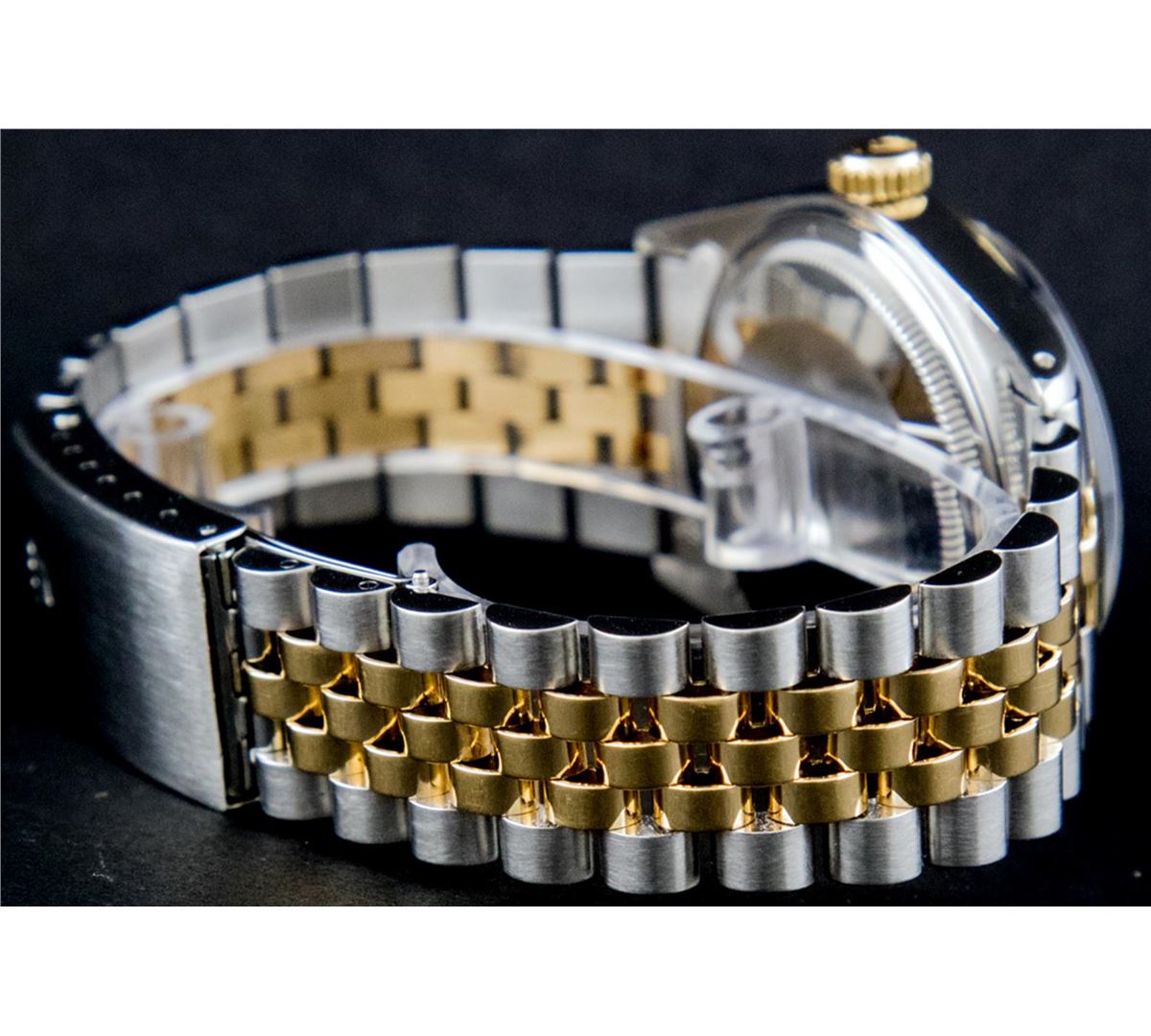 One Gents Two Tone Rolex Datejust Polished, Serviced & Electronically Tested, 14K Yellow Gold & Stainless Steel Case:36mm, 14K Yellow Gold Crown, Bezel: 14K Yellow Gold Fluted Bezel. Custom Crystal: Acrylic Cyclops Lens. Movement: Automatic Winding Movement Caliber 3035. Custom Dial: Black Diamond Dial, Diamond Count: 10 Diamonds In Dial, Color: G to H, Clarity: SI-VS. Date Window: 3 O'Clock Position Date Display, Quickset, Model: 16013 Condition: G-6 Extra Fine. Bracelet: Two Tone 14K Yellow Gold & Stainless Steel Jubilee. Bright Polish. 6.5 Inch Length, Adjustable. Standard Clasp, With Rolex Logo.