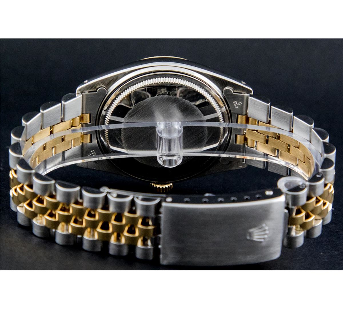 One Gents Two Tone Rolex Datejust Polished, Serviced & Electronically Tested, 14K Yellow Gold & Stainless Steel Case:36mm, 14K Yellow Gold Crown, Bezel: 14K Yellow Gold Fluted Bezel. Custom Crystal: Acrylic Cyclops Lens. Movement: Automatic Winding Movement Caliber 3035. Custom Dial: Black Diamond Dial, Diamond Count: 10 Diamonds In Dial, Color: G to H, Clarity: SI-VS. Date Window: 3 O'Clock Position Date Display, Quickset, Model: 16013 Condition: G-6 Extra Fine. Bracelet: Two Tone 14K Yellow Gold & Stainless Steel Jubilee. Bright Polish. 6.5 Inch Length, Adjustable. Standard Clasp, With Rolex Logo.