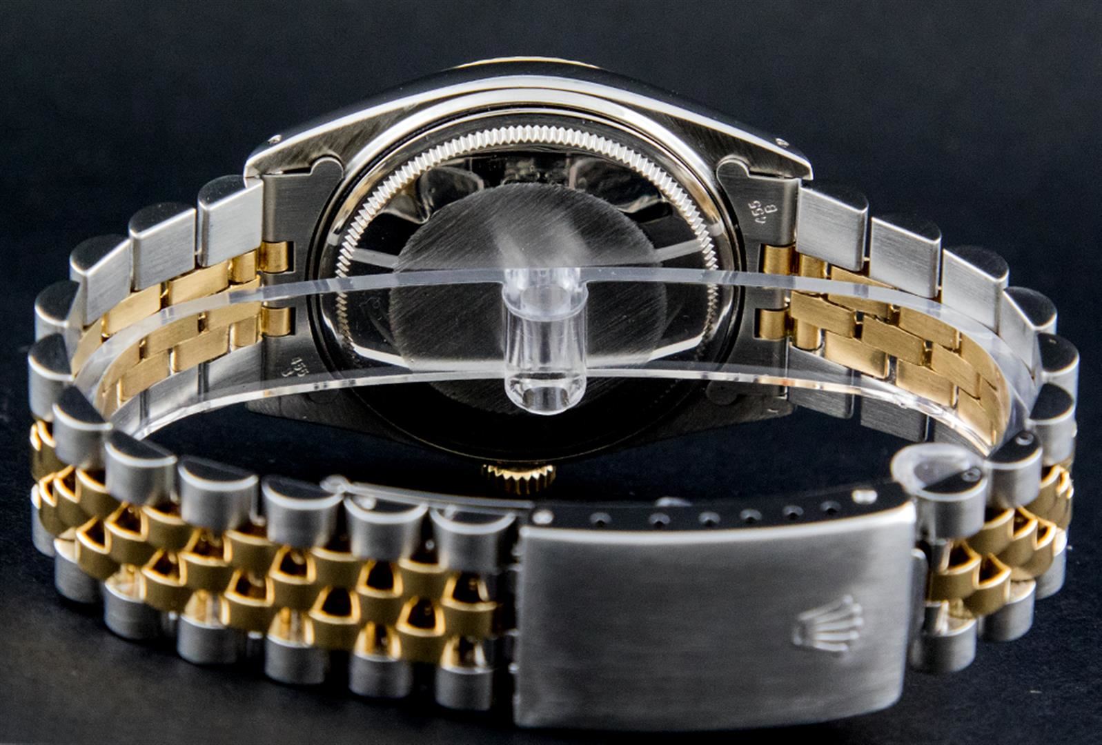 One Gents Two Tone Rolex Datejust Polished, Serviced & Electronically Tested, 14K Yellow Gold & Stainless Steel Case:36mm, 14K Yellow Gold Crown, Bezel: 14K Yellow Gold Fluted Bezel. Custom Crystal: Acrylic Cyclops Lens. Movement: Automatic Winding Movement Caliber 3035. Custom Dial: Black Diamond Dial, Diamond Count: 10 Diamonds In Dial, Color: G to H, Clarity: SI-VS. Date Window: 3 O'Clock Position Date Display, Quickset, Model: 16013 Condition: G-6 Extra Fine. Bracelet: Two Tone 14K Yellow Gold & Stainless Steel Jubilee. Bright Polish. 6.5 Inch Length, Adjustable. Standard Clasp, With Rolex Logo.