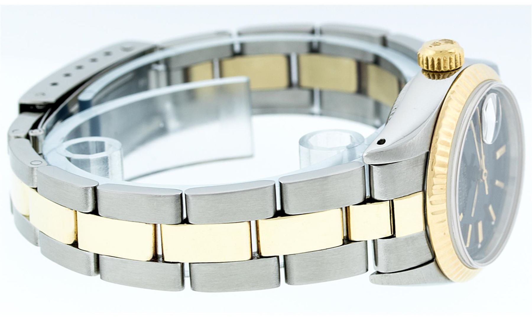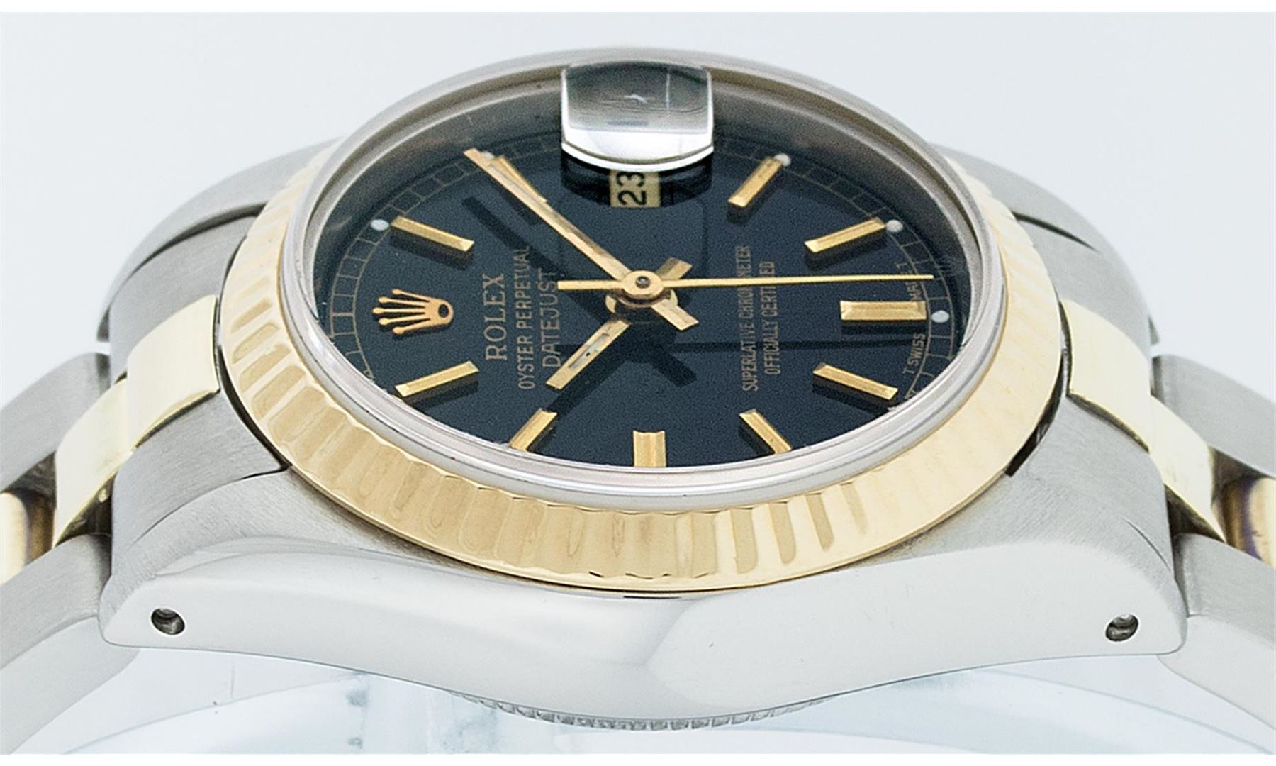 One Ladies Two Tone Rolex Datejust Polished, Serviced & Electronically Tested, 14K Yellow Gold & Stainless Steel Case:26mm, 14K Yellow Gold Crown, Bezel: 14K Yellow Gold Fluted Bezel. Custom Crystal: Acrylic Cyclops Lens. Movement: Automatic Winding Movement Caliber 2030. Dial: Black Index Dial With Lumi Dots. Date Window: 3 O'Clock Position Date Display, Model: Datejust. Condition: G-6 Extra Fine. Bracelet: Two Tone 14K Yellow Gold & Stainless Steel Oyster Band. Bright Polish. 6.0 Inch Length, Adjustable. Standard Clasp, With Rolex Logo.